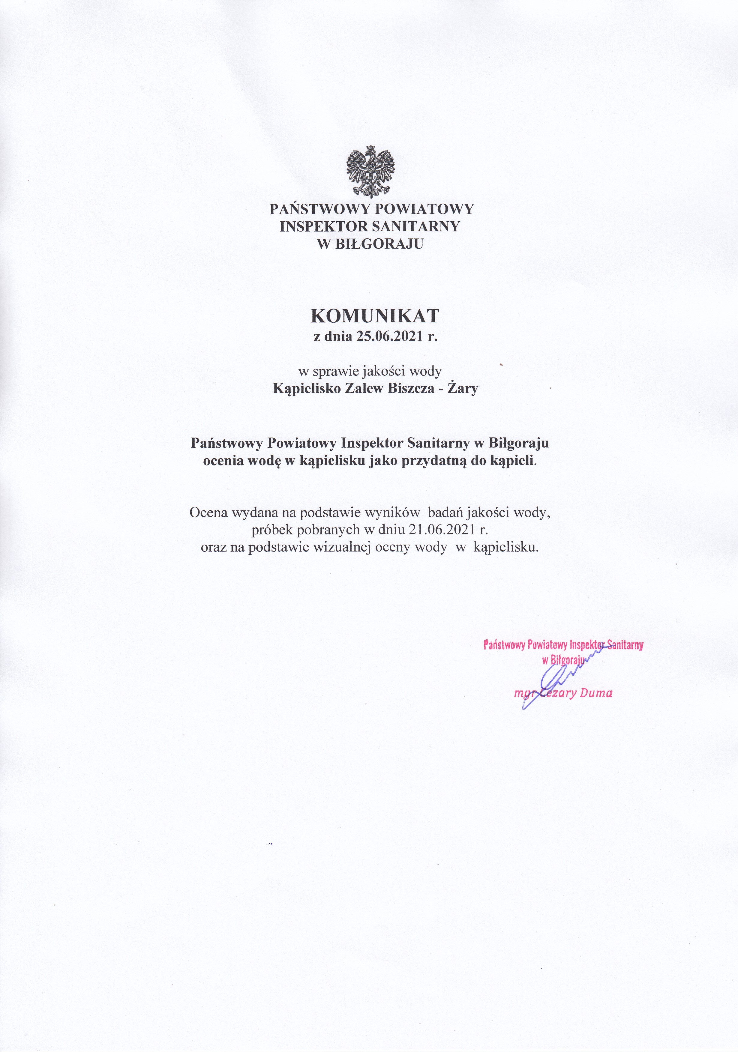 Państwowy Powiatowy Inspektor Sanitarny w Biłgoraju zamieszcza poniżej komunikat o jakości wody w kąpielisku Zalew Biszcza - Żary.