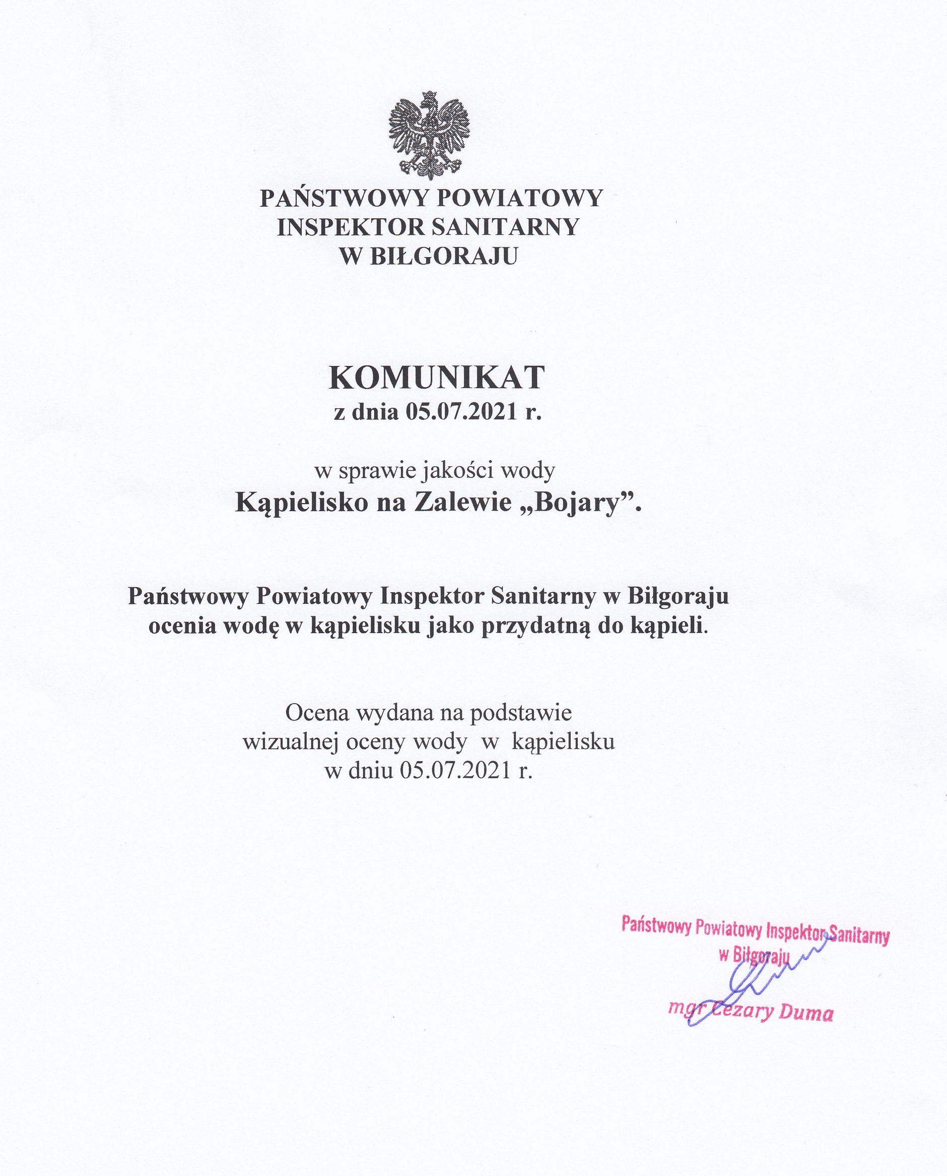 Państwowy Powiatowy Inspektor Sanitarny w Biłgoraju zamieszcza w załączeniu komunikat dotyczący jakości wody w kąpielisku na Zalewie "Bojary".