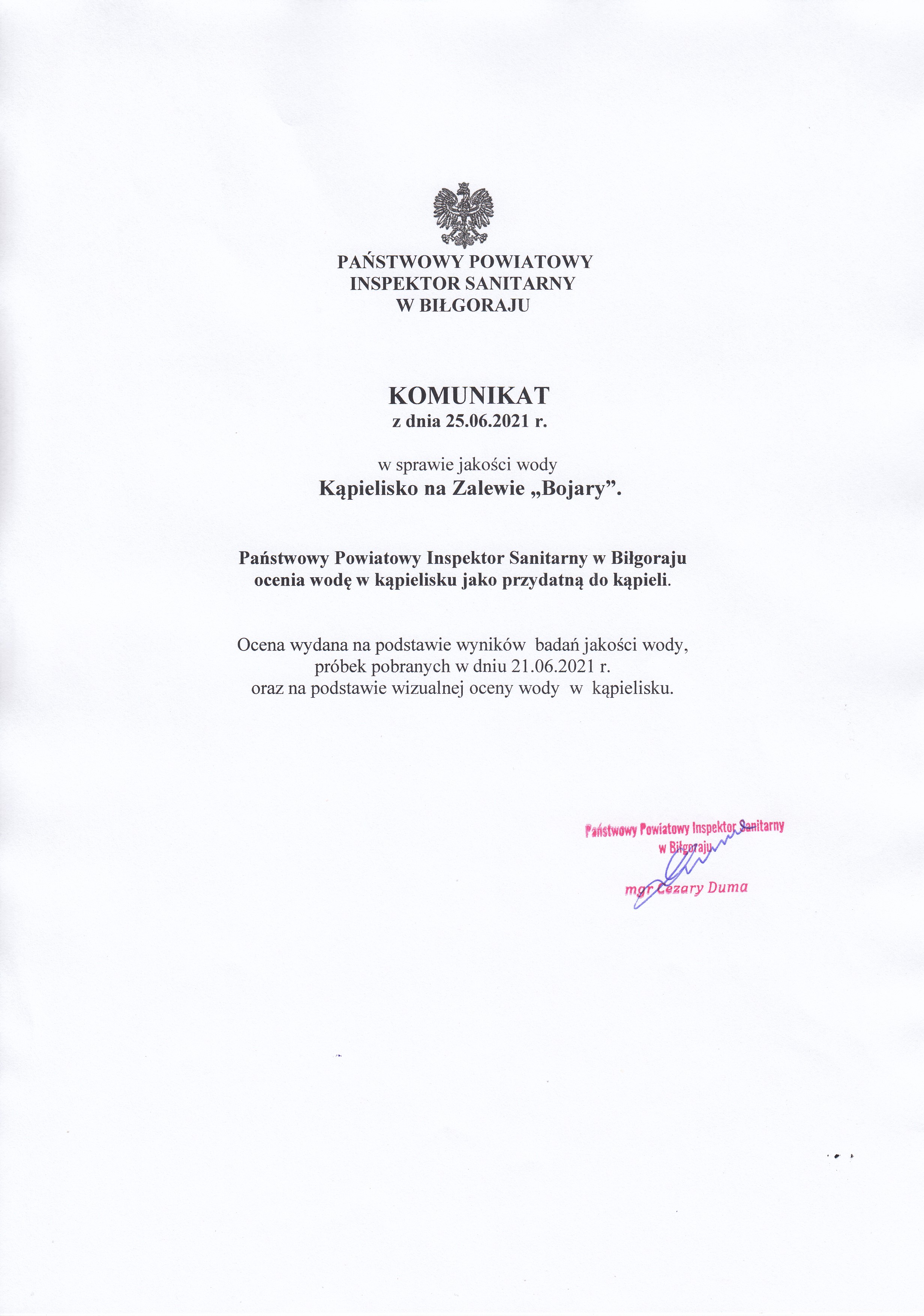 Państwowy Powiatowy Inspektor Sanitarny w Biłgoraju zamieszcza poniżej komunikat o jakości wody w kąpielisku na Zalewie "Bojary".