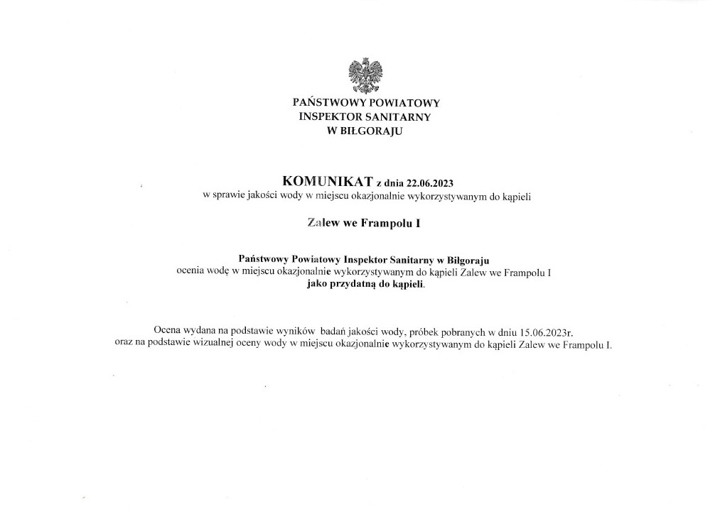 Komunikat o jakości wody w miejscu wykorzystywanym do kąpieli na Zalewie we Frampolu I (2023-06-22)
