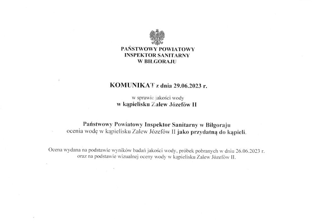 Państwowy Powiatowy Inspektor Sanitarny w Biłgoraju zamieszcza w załączeniu komunikat o stanie jakości wody w kąpielisku Zalew Józefów II, stan na dzień 2023-06-29.