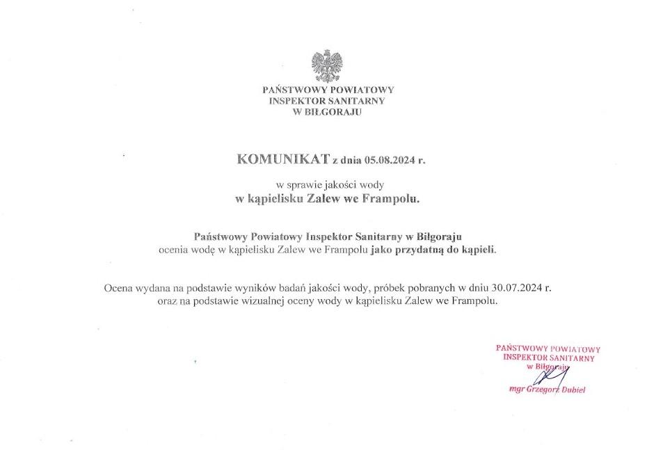Państwowy Powiatowy Inspektor Sanitany w Biłgoraju zamieszcza poniżej komunikat z dnia 05.08.2024r w sprawie jakości wody w kąpielisku Zalew we Frampolu.