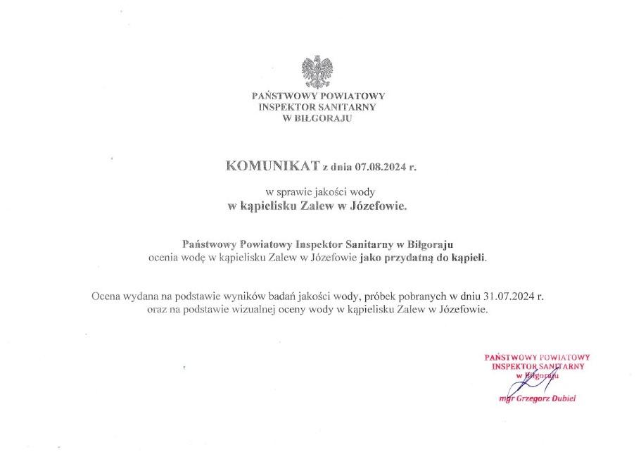 Państwowy Powiatowy Inspektor Sanitarny w Biłgoraju ogłasza poniżej komunikat z dnia 07.08.2024 r. w sprawie jakości wody w kąpielisku Zalew w Józefowie.