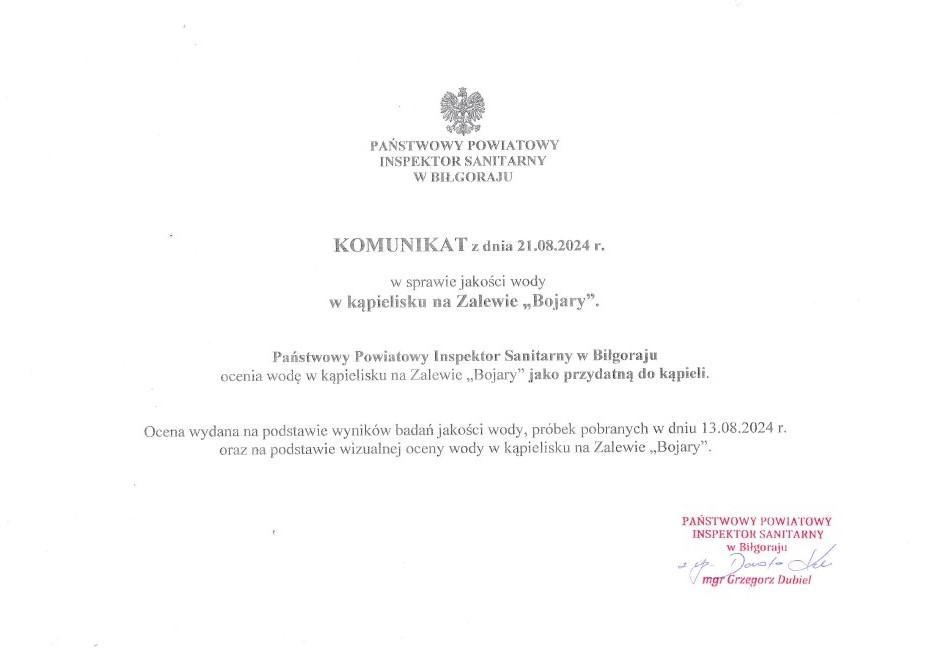 Państwowy Powiatowy Inspektor Sanitarny w Biłgoraju zamieszcza poniżej komunikat z dnia 21.08.2024r. w sprawie jakości wody w kąpielisku na Zalewie "Bojary".