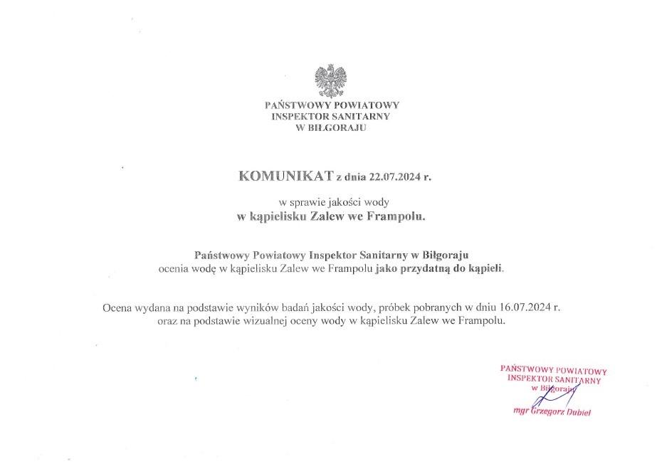 Państwowy Powiatowy Inspektor Sanitarny w Biłgoraju zamieszcza poniżej komunikat z dnia 22.07.2024 r. w sprawie jakości wody w kąpielisku Zalew we Frampolu.