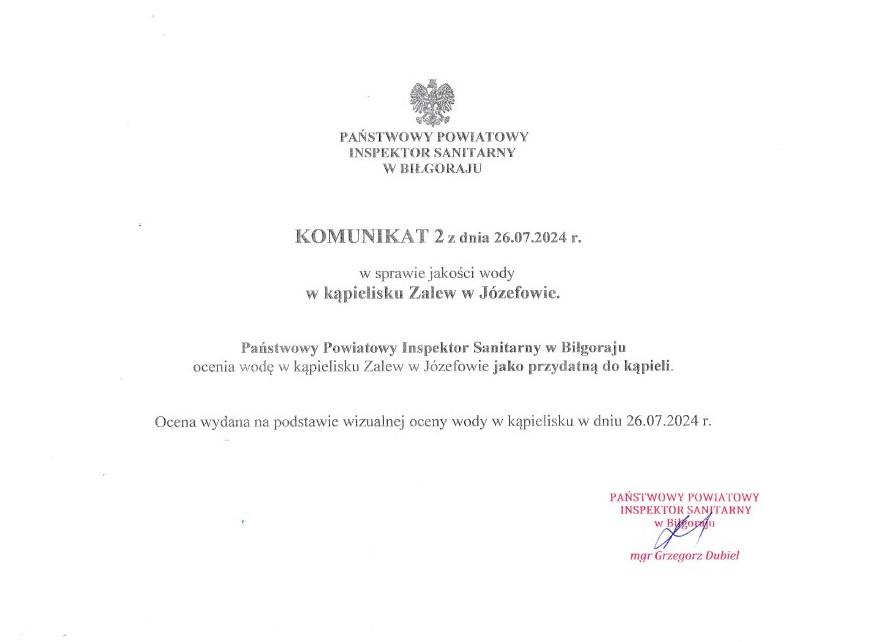 Państwowy Powiatowy Inspektor Sanitarny w Biłgoraju zamieszcza w załączeniu komunikat z dnia 26.07.2024 r. w sprawie jakości wody w kąpielisku Zalew w Józefowie.