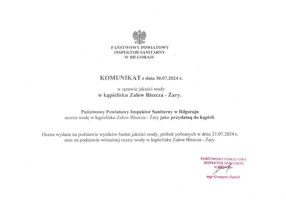 Państwowy Powiatiowy Inspektor Sanitarny w Biłgoraju zamieszcza poniżej komunikat z dnia 30.07.2024 r. w sprawie jakości wody w kąpielisku Zalew Biszcza - Żary.
