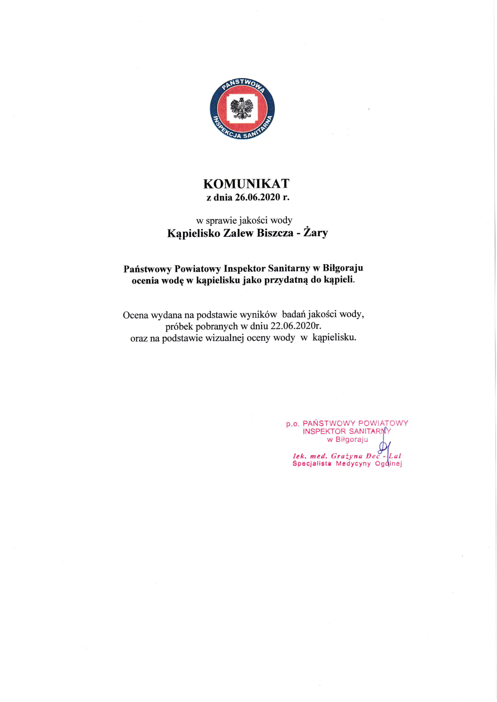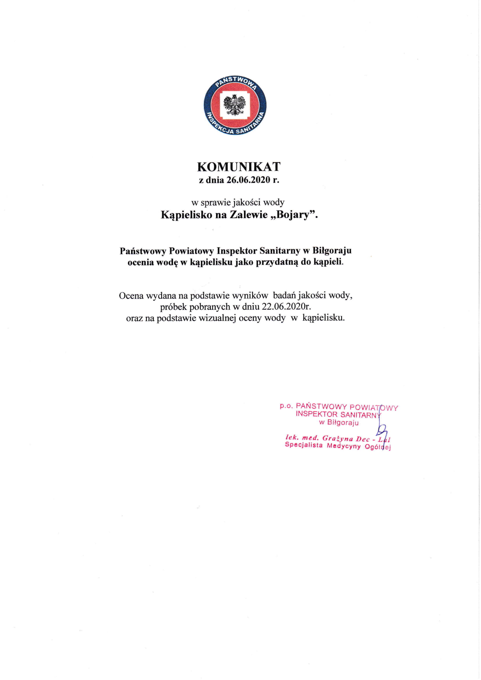 Państwowy Powiatowy Inspektor Sanitarny w Biłgoraju przedstawia komunikaty o jakości wody w kąpieliskach i miejscach przeznaczonych do kąpieli w powiecie biłgorajskim.