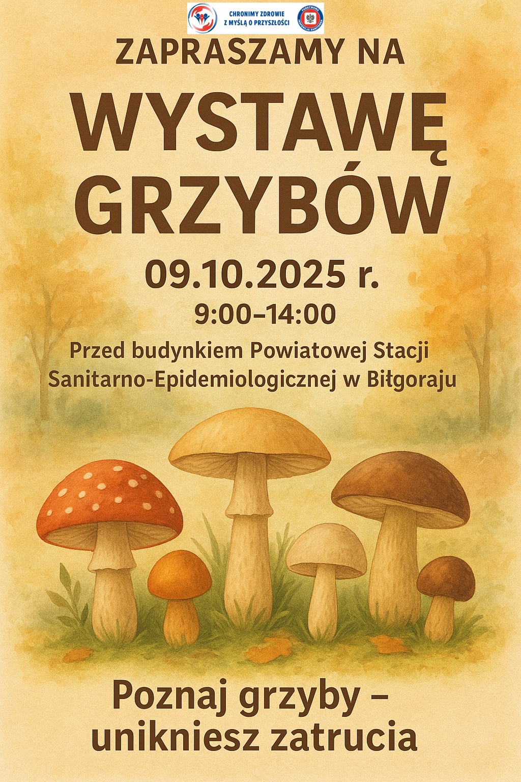 Państwowy Powiatowy Inspektor Sanitarny w Biłgoraju zaprasza na wystawę grzybów w dniu 9.10.2025r. przed budynkiem Powiatowej Stacji Sanitarno-Epidemiologicznej w Bilgoraju.
