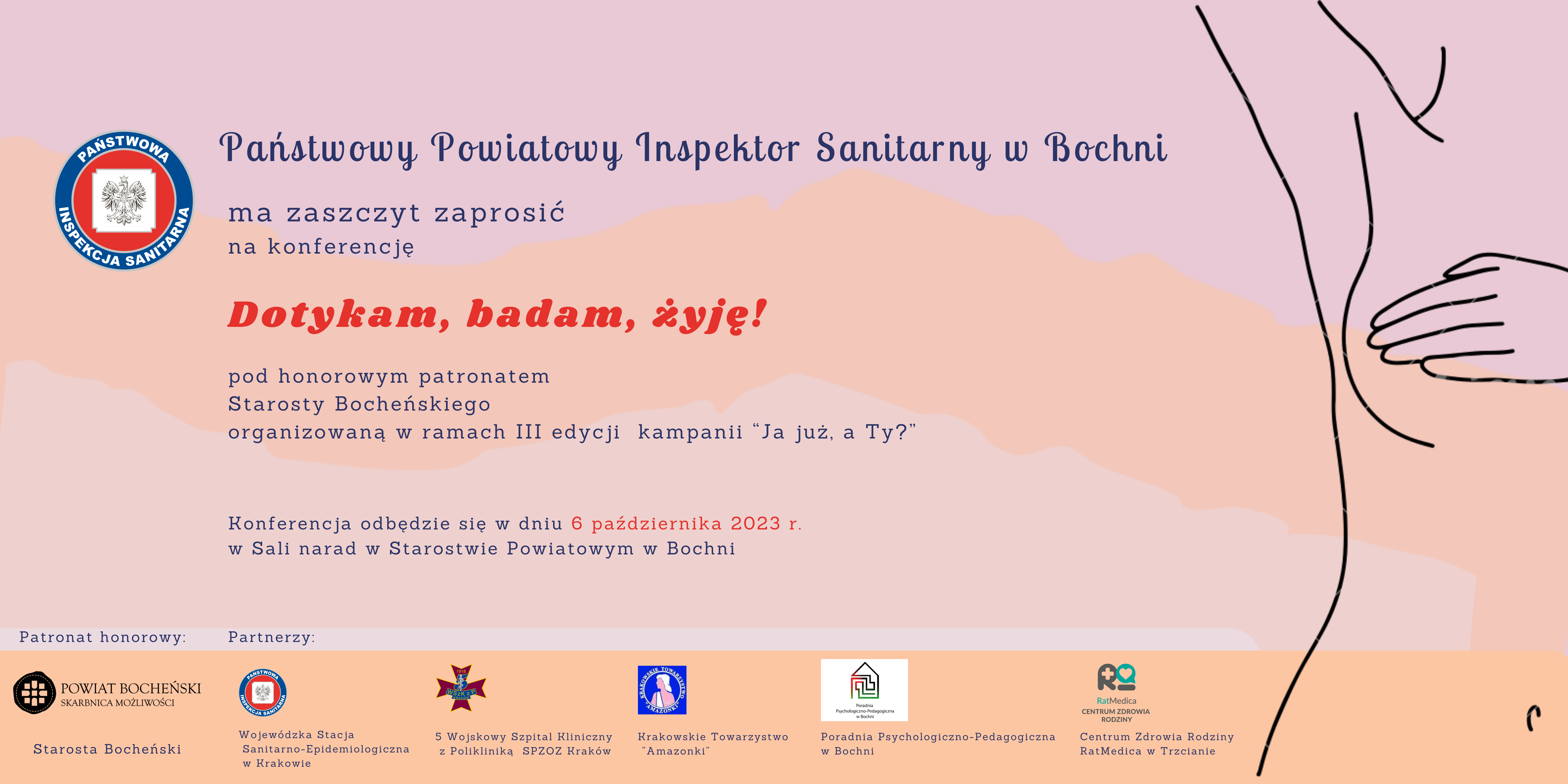 Powiatowa Stacja Sanitarno-Epidemiologiczna w Bochni we współpracy Starostwem Powiatowym w Bochni serdecznie zapraszają na konferencję pod tytułem: „Dotykam, badam, żyję!”, poświęconą profilaktyce raka piersi. Konferencja ma formę stacjonarną i odbędzie się 6 października 2023 r. w Sali narad w Starostwie Powiatowym w Bochni (I piętro).