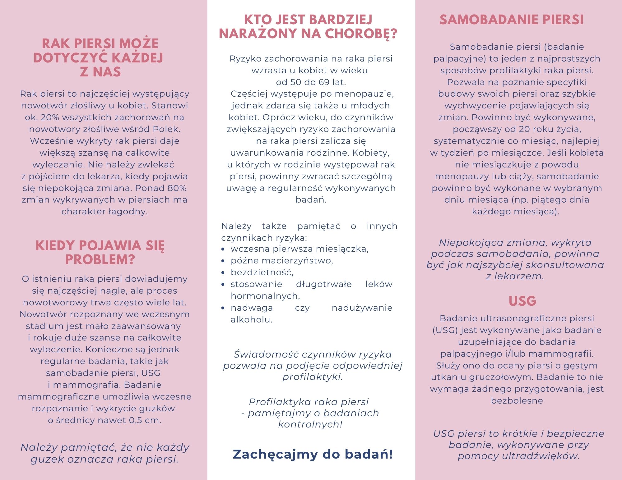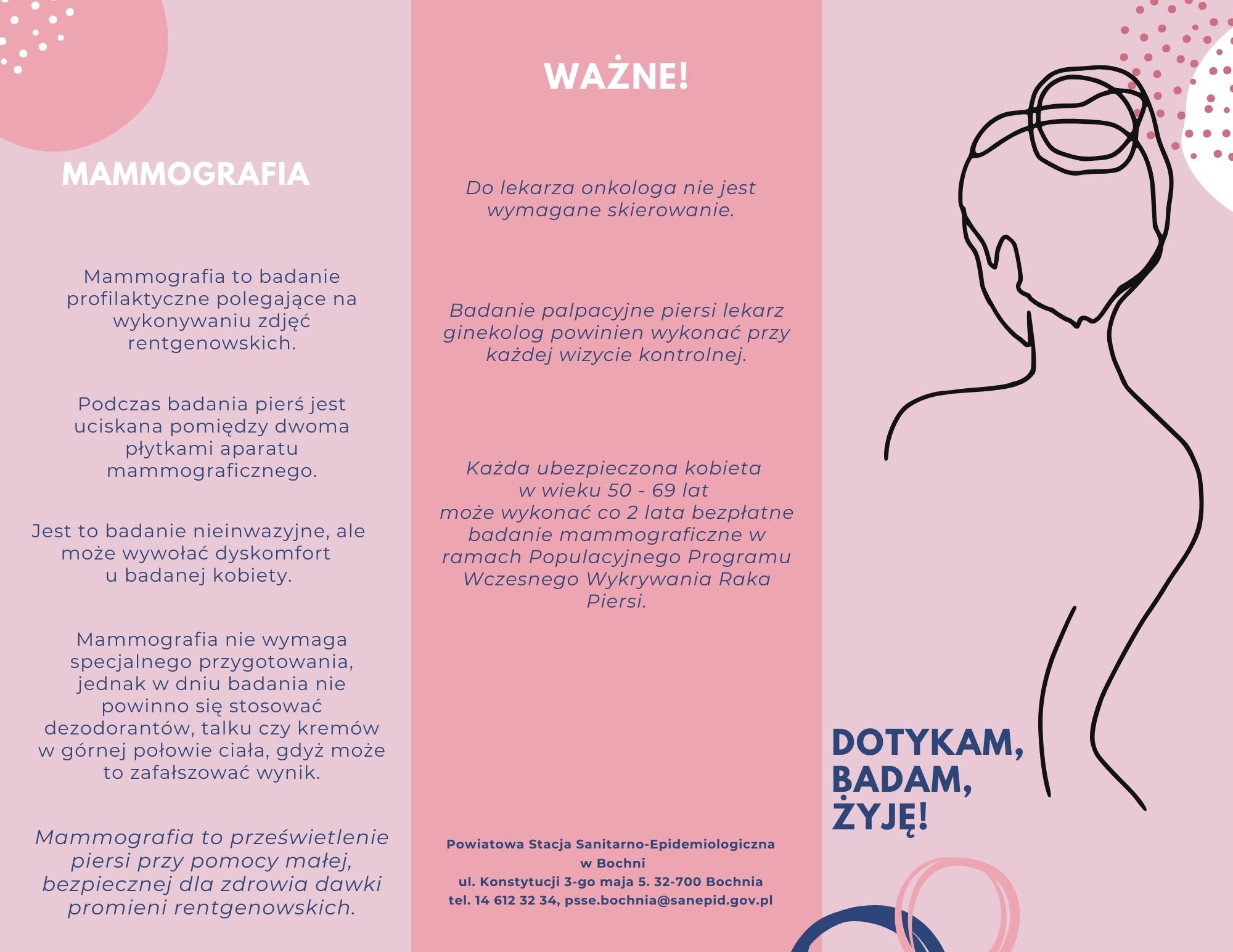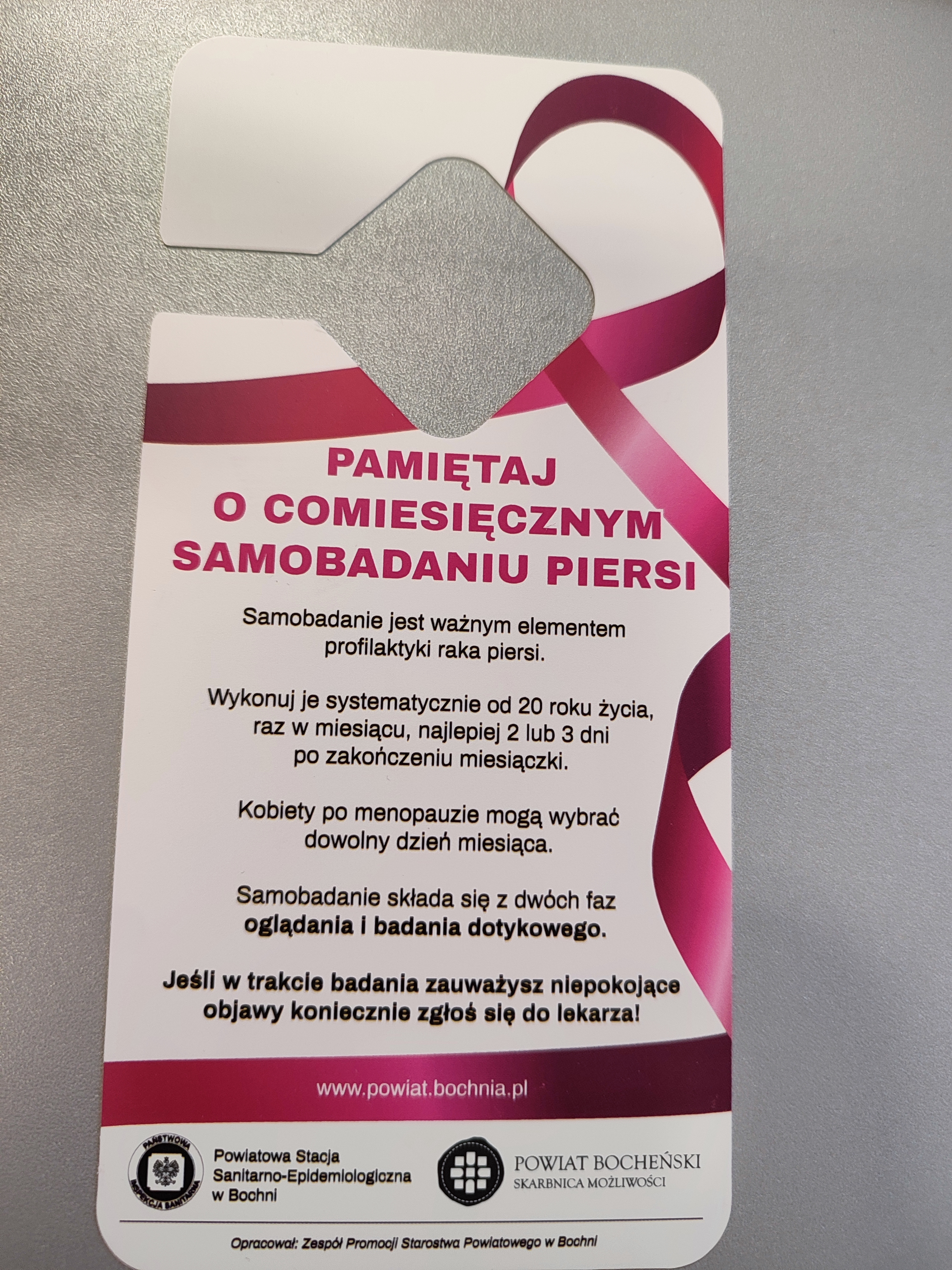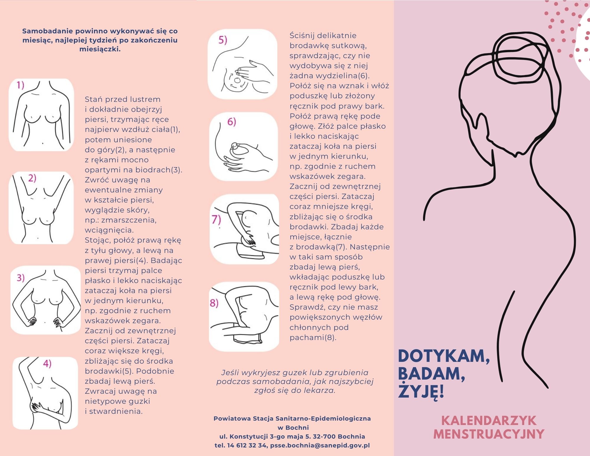 Kładąc nacisk na właściwą i wczesną edukację młodzieży PSSE w Bochni przygotowała także ulotkę z podstawowymi informacjami dotyczącymi samobadania piersi, badań przesiewowych, USG i mammografii oraz ulotkę na temat technik samobadania z kalendarzykiem menstruacyjnym, by ułatwić kobietom prowadzenie regularnych obserwacji swojego ciała.
