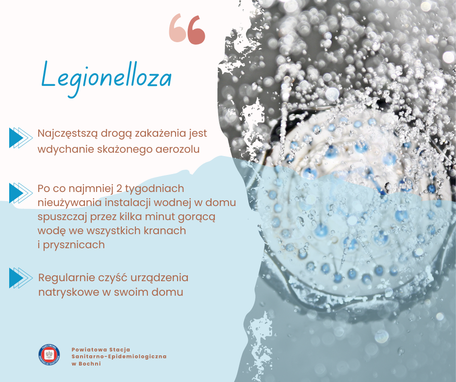 Legionelloza jest chorobą zakaźną, ale nie zaraźliwą, nie przenosi się z człowieka na człowieka, stanowi zagrożenie dla ludzi gdy dostanie się do dróg oddechowych. Do zakażenia może dochodzić poprzez wdychanie powietrza, w którym znajduje się aerozol skażonej bakteriami wody (mgła wodna powstała w wyniku rozprysku wody). Podczas oddychania kropelki aerozolu dostają się do naszych dróg oddechowych i osadzają na błonach śluzowych nosa lub płucach.