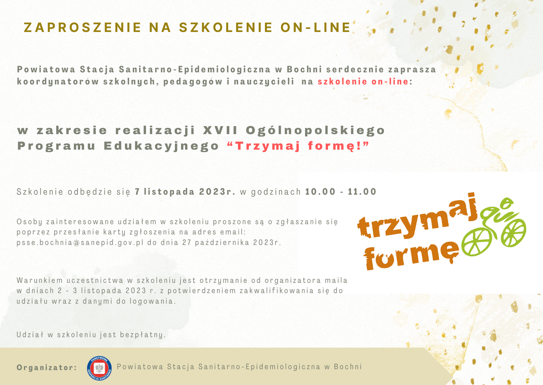 W związku z powyższym Państwowy Powiatowy Inspektor Sanitarny w Bochni zaprasza szkolnych koordynatorów programu „Trzymaj formę!” do udziału w szkoleniu on-line, które odbędzie się 7 listopada 2023 r. o godz. 10.00. Podczas szkolenia przekazane zostaną szczegółowe informacje na temat przebiegu tegorocznej edycji Programu oraz Konkursu wiedzy o zdrowym stylu życia „Trzymaj formę!” w roku szkolnym 2023/2024.