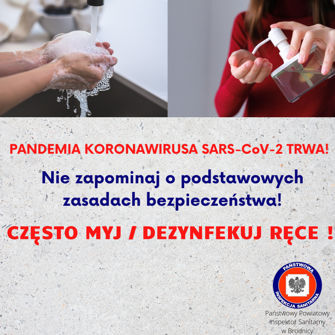 Państwowy Powiatowy Inspektor Sanitarny w Brodnicy w dobie panującej pandemii koronawirusa SARS-CoV-2 apeluje do mieszkańców Brodnicy i powiatu brodnickiego o wykazanie odpowiedzialności i przestrzeganie podstawowych zasad bezpieczeństwa. W chwili obecnej IV fala pandemii COVID-19 „rozpędza” się, co obrazuje zwiększająca się sukcesywnie liczba stwierdzanych przypadków zakażeń w skali kraju, województwa kujawsko-pomorskiego, a także powiatu brodnickiego.