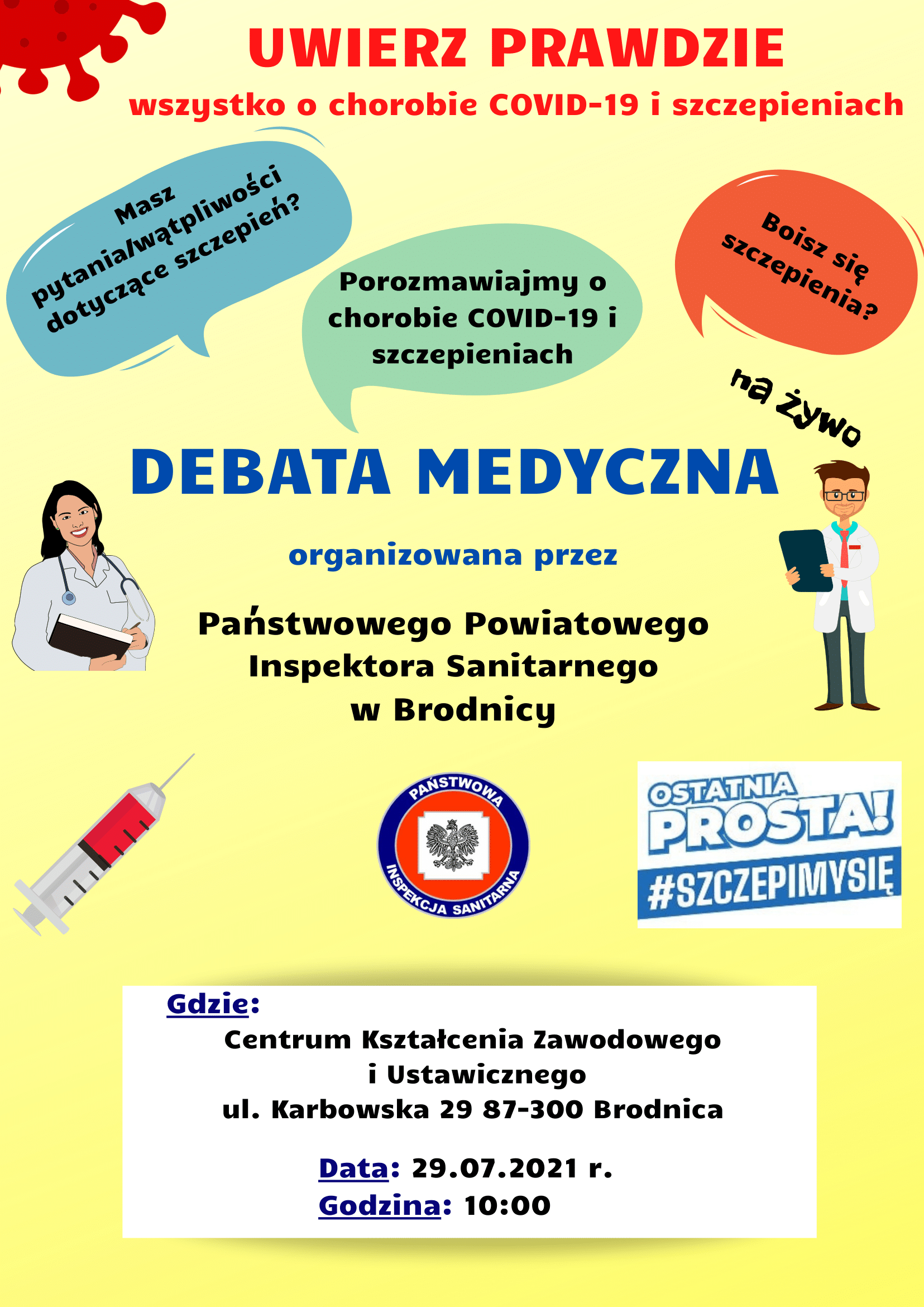 Państwowy Powiatowy Inspektor Sanitarny w Brodnicy w związku działaniami promocyjnymi mającymi na celu poprawę poziomu zaszczepienia przeciwko COVID-19 mieszkańców Brodnicy, zwłaszcza seniorów w wieku 60 + pragnie aktywnie współdziałać w społecznej kampanii promowania szczepień zorganizowanej przez Pana Burmistrza Brodnicy i Starostę Brodnickiego w dniu 29.07.2021 r. o godz. 10.00 w auli Centrum Kształcenia Zawodowego i Ustawicznego, przy ul. Karbowskiej 29 w Brodnicy i zorganizować w tym dniu debatę medyczną pn. „Uwierz prawdzie” – wszystko o chorobie COVID-19 i szczepieniach, podczas której lekarze pracujący na oddziale leczenia pacjentów z COVID-19 w brodnickim szpitalu, psycholodzy, epidemiolodzy odpowiedzą na kluczowe pytania dot. choroby oraz roli szczepień w oparciu o własne doświadczenia, naukowe ekspertyzy i dostępną wiedzę z różnych perspektyw.