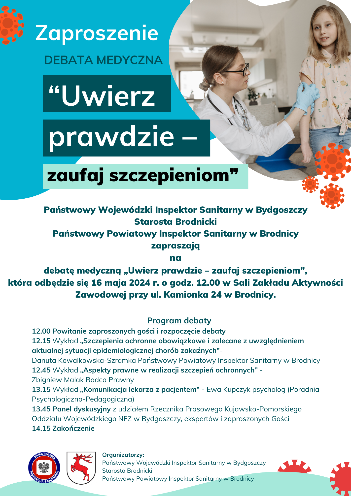 Państwowy Wojewódzki Inspektor Sanitarny w Bydgoszczy, Starosta Brodnicki i Państwowy Powiatowy Inspektor Sanitarny w Brodnicy serdecznie zapraszają na debatę medyczną pracowników służby zdrowia (lekarzy, pielegniarki, położne) „Uwierz prawdzie – zaufaj szczepieniom”, która odbędzie się 16 maja 2024 r. o godz. 12.00 w sali konferencyjnej Zakładu Aktywności Zawodowej przy ul. Kamionka 24 w Brodnicy.