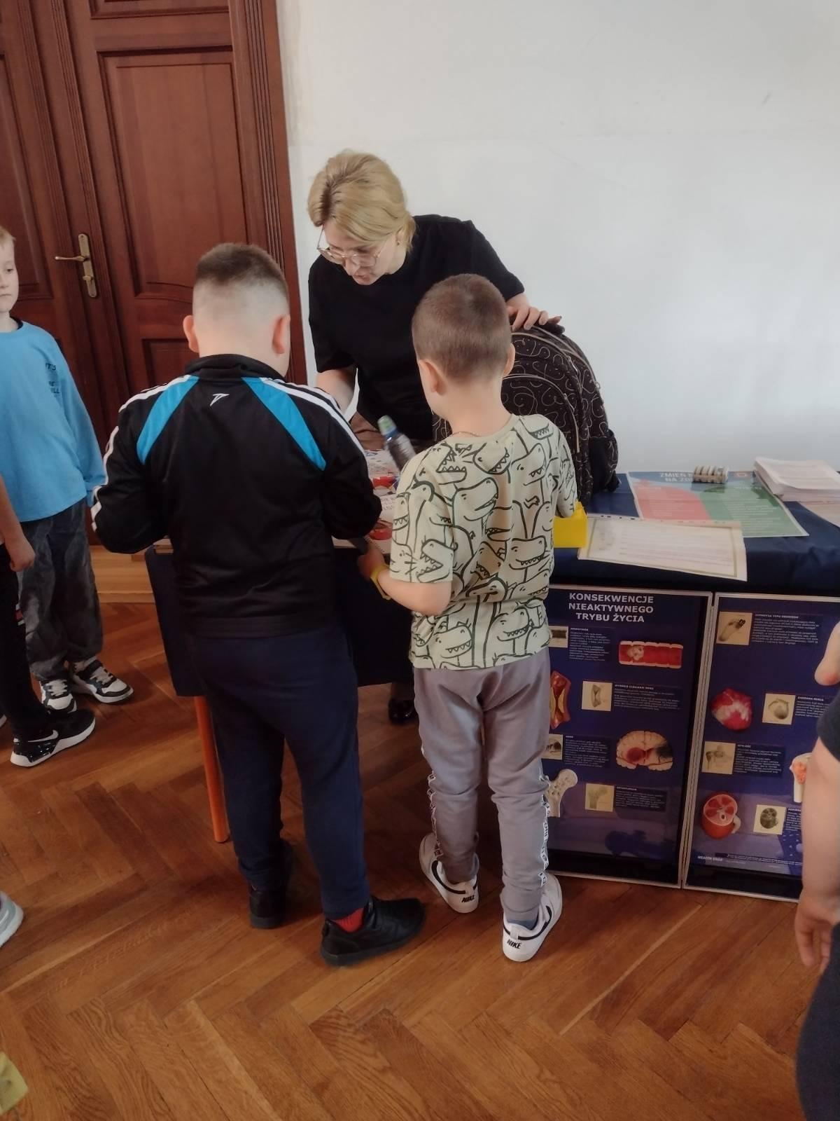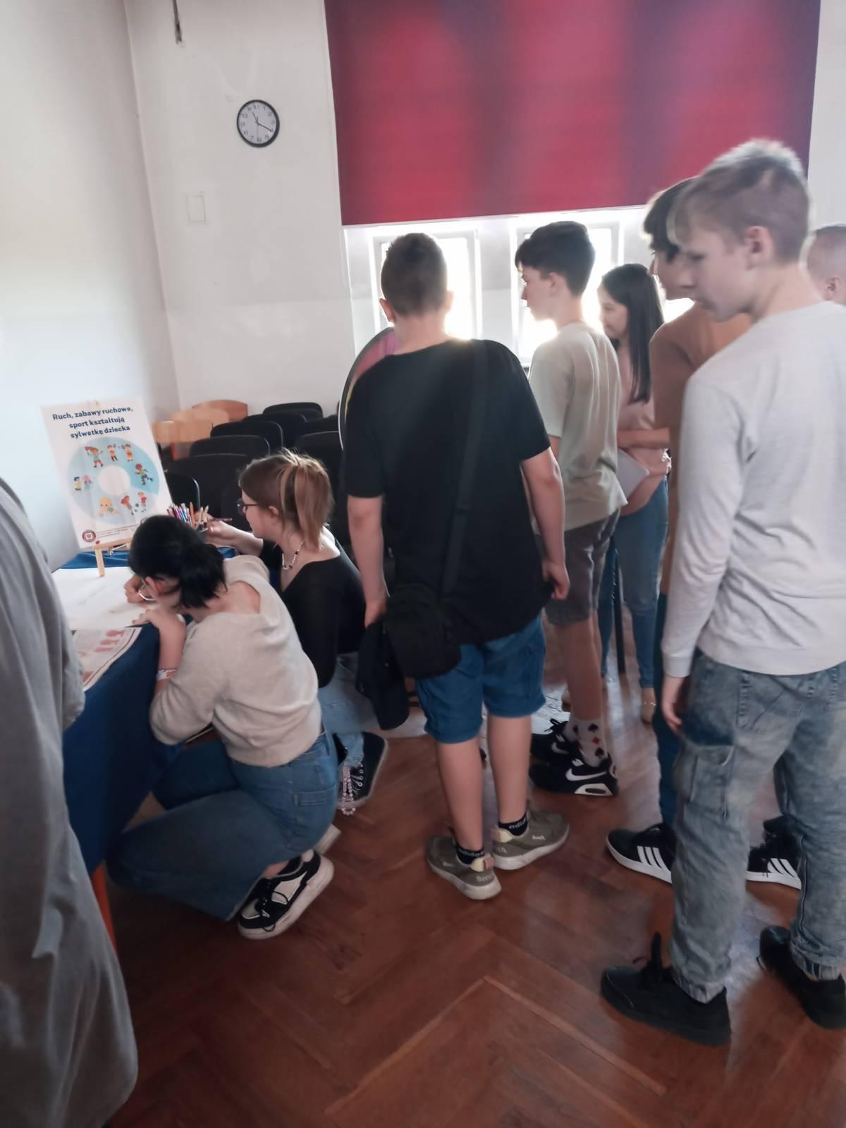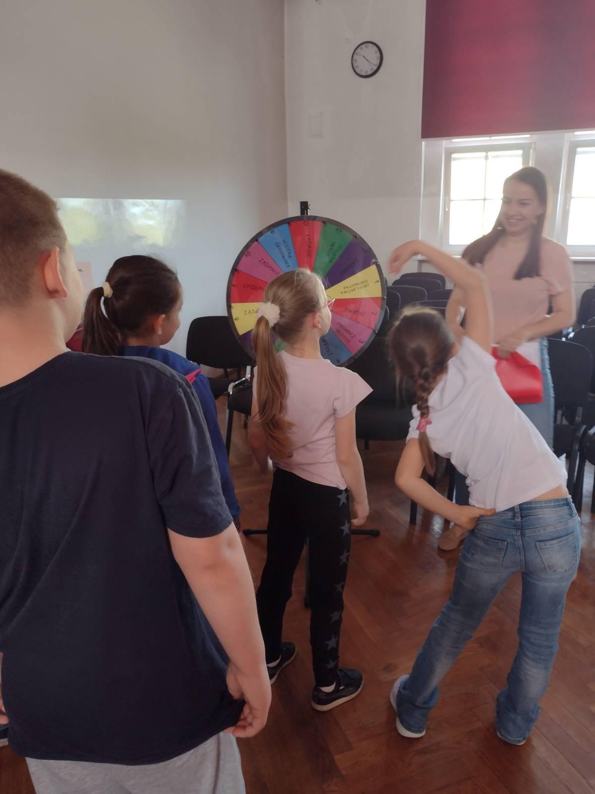 Duże zainteresowanie wśród młodych ludzi wzbudziła edukacyjna gra „Zakręć kołem fortuny i sprawdź swoją wiedzę o zdrowiu”. Uczniowie chętnie odpowiadali na pytania z poszczególnych kategorii dotyczących zdrowia oraz wykonywali różne zadania ruchowe.