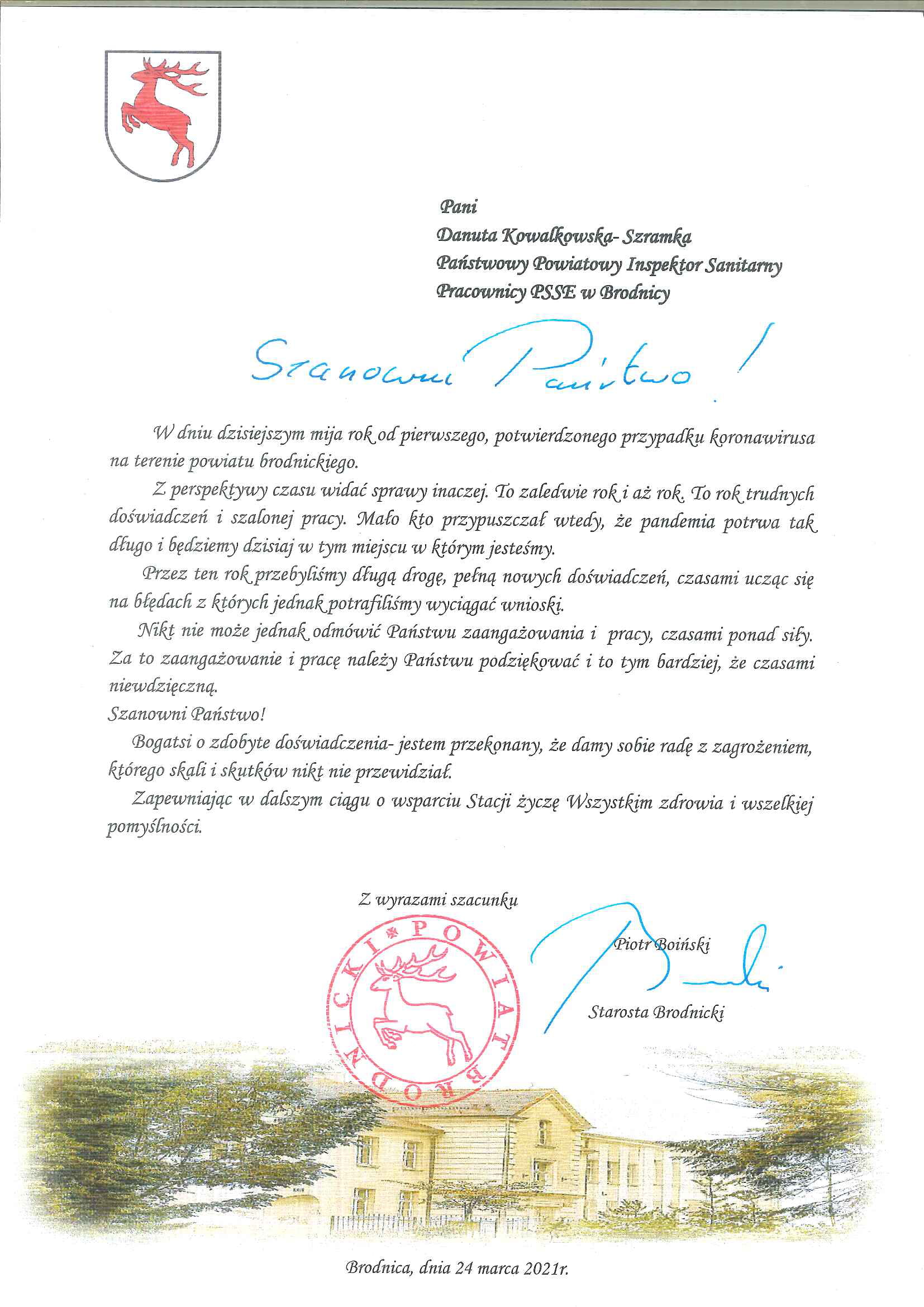 Serdecznie dziękujemy Panu Staroście Brodnickiemu za wszelką pomoc i wspieranie Powiatowej Stacji Sanitarno-Epidemiologicznej w Brodnicy w działaniach z zakresu zdrowia publicznego w tak trudnym czasie pandemii
