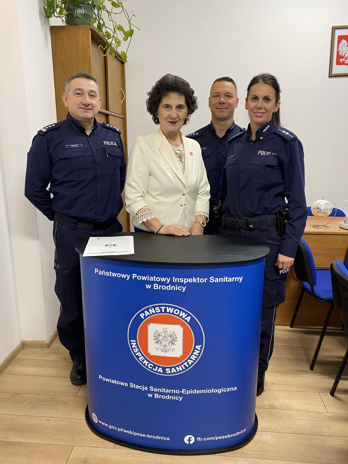 7 stycznia 2026 r. w siedzibie Powiatowej Stacji Sanitarno-Epidemiologicznej w Brodnicy odbyło się spotkanie, w którym uczestniczyli: Państwowy Powiatowy Inspektor Sanitarny w Brodnicy – Danuta Kowalkowska-Szramka, Komendant Powiatowy Policji Brodnicy – Inspektor Tomasz Skoneczka, Zastępca KPP w Brodnicy – Nadkomisarz Krzysztof Miłek i Aspirant KPP w Brodnicy Izabela Rapicka, zatrudniona na Stanowisku ds. Profilaktyki Społecznej, Nieletnich i Patologii.