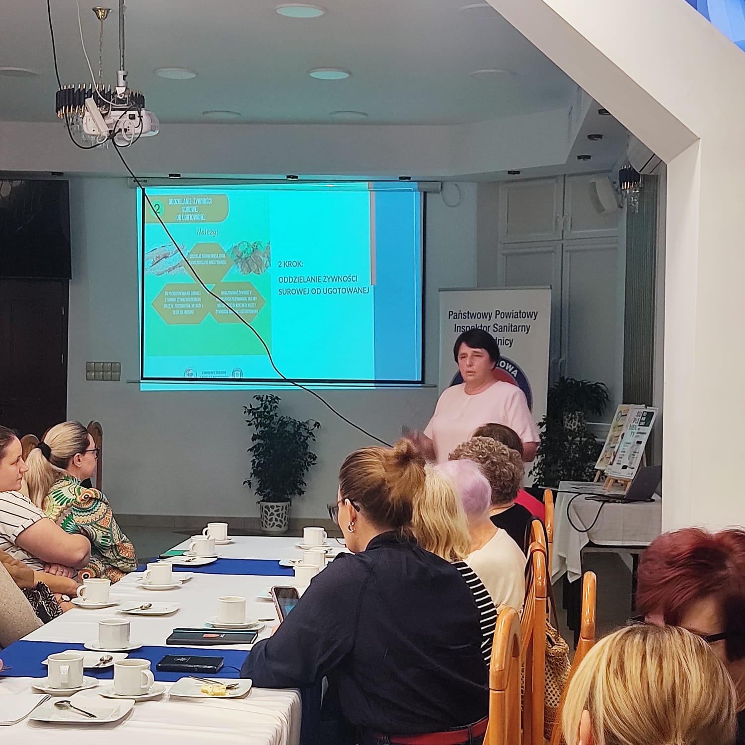 Podczas szkolenia przedstawiono zebranym warunki, jakie muszą spełniać pomieszczenia, w których prowadzona jest produkcja posiłków.