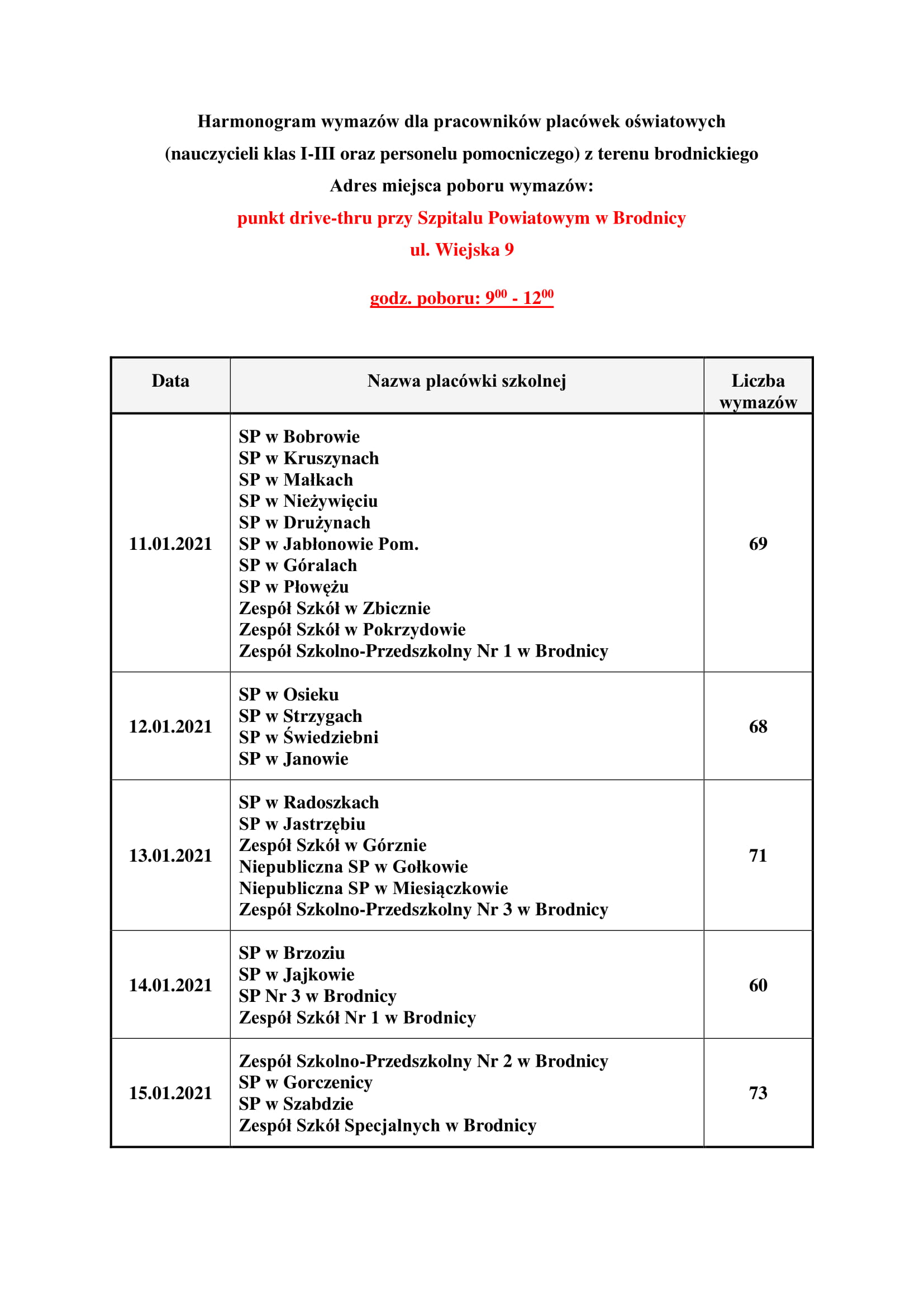 Nauczycieli/pracowników szkół zgłoszonych do wymazu przez placówki oświatowe z terenu powiatu brodnickiego zapraszamy do zapoznania się z harmonogramem poboru oraz podstawowymi informacjami dotyczącymi przygotowania się do badania.