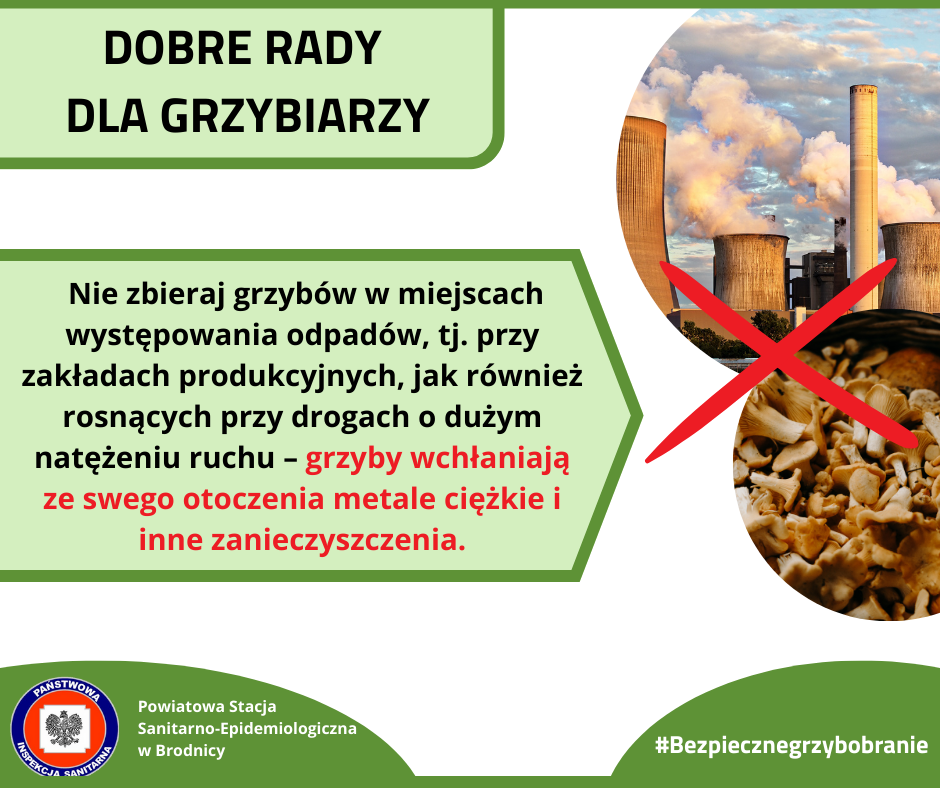 - Nigdy nie zbieraj grzybów, które rosną w rowach, na skraju lasu oraz w okolicach skupisk odpadów (np. przy zakładach produkcyjnych czy drogach o dużym natężeniu ruchu), ponieważ grzyby wchłaniają ze swego otoczenia metale ciężkie i inne zanieczyszczenia.