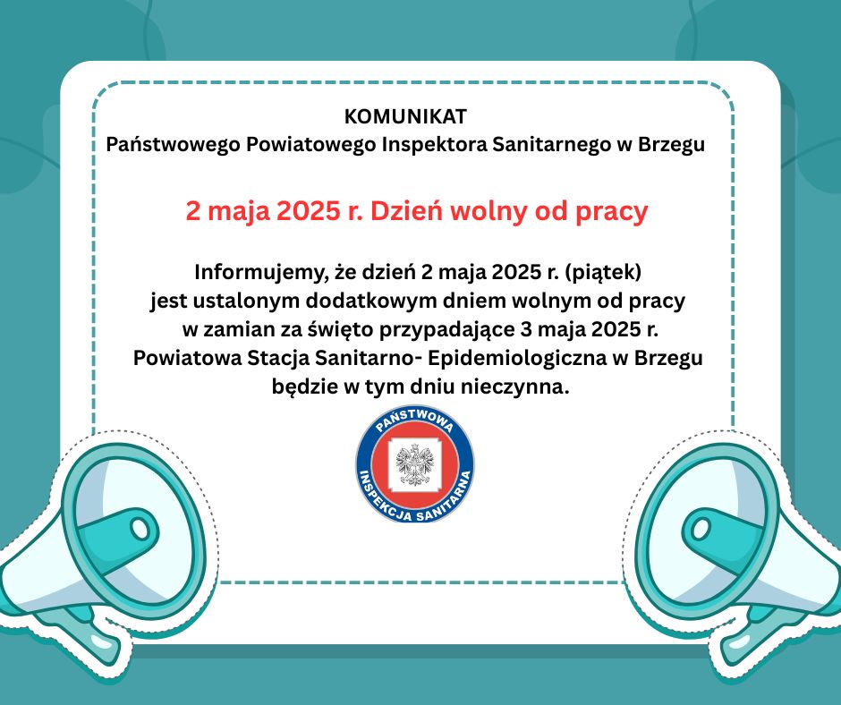 Komunikat Państwowego Powiatowego Inspektora Sanitarnego w Brzegu - 2 maja 2025 r. Dzień wolny od pracy 30.04.2025 Zdjęcia (1) Pokaż zdjęcie 1 z galerii.