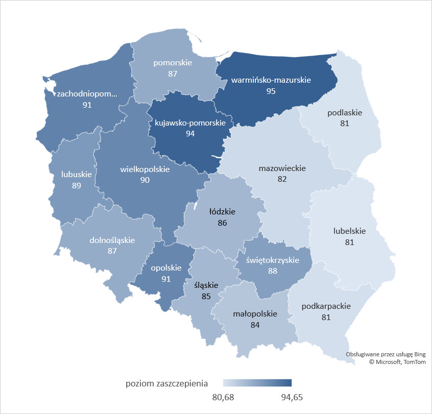 | Poziom zaszczepienia % | 91,60 | 90,10 | 87,40 | 86,60 | 85,50 | 83,9 | 84,9 | 87,0 |
