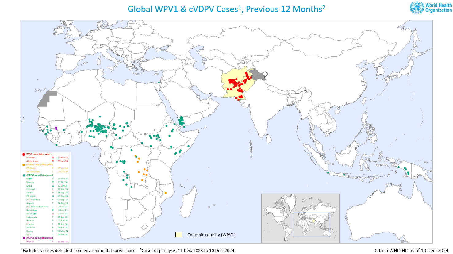 Ryc. 1 Mapa występowania przypadków polio wywołanych WPV1 oraz cVDPV w okresie ostatnich 12 miesięcy.