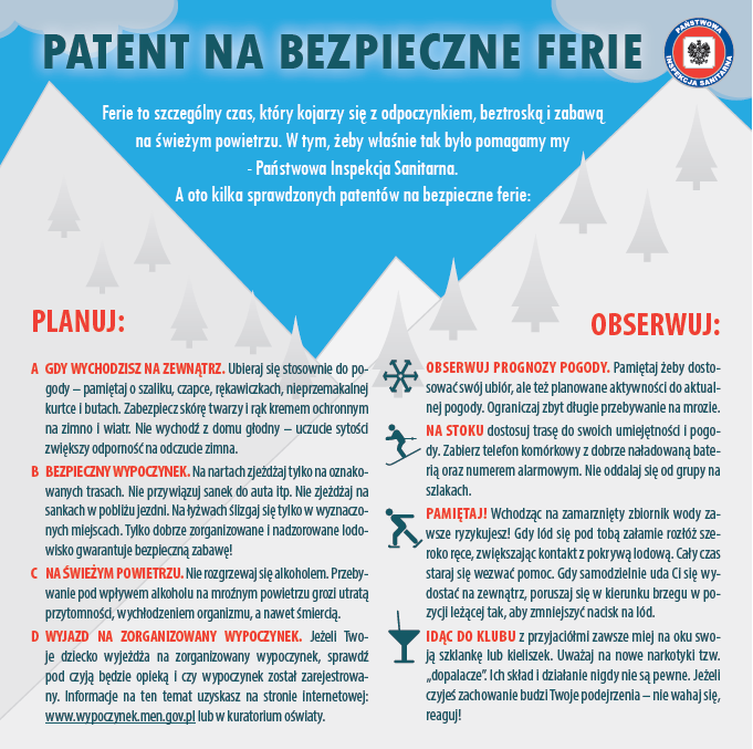 Obok działań kontrolno-nadzorowych Państwowa Inspekcja Sanitarna prowadzi również działania edukacyjne i profilaktyczne, skierowane do dzieci, młodzieży, rodziców i opiekunów. W okresie ferii zimowych szczególny nacisk kładziony jest na: