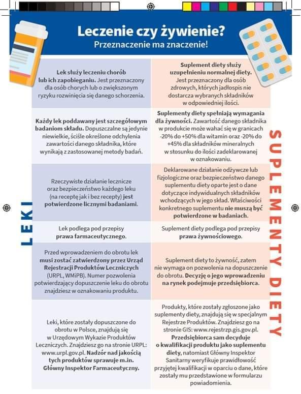 Różnic między lekiem a suplementem jest wiele. Przede wszystkim, suplement nie leczy. Jego celem jest jedynie uzupełnianie codziennej diety. Przy nazwie produktu musi natomiast pojawić się zwrot „suplement diety”. Konsument powinien nie mieć wątpliwości, że kupuje suplement diety, a nie lek.