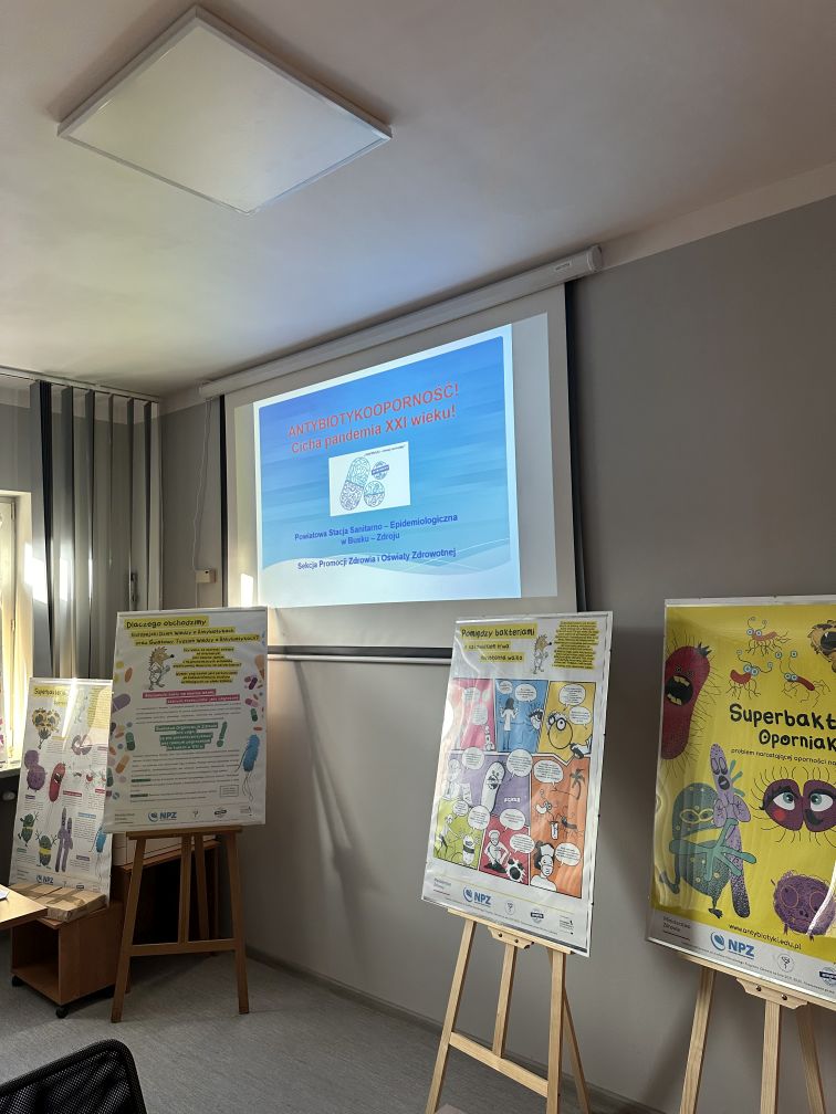 Pracownicy Sekcji Promocji Zdrowia i Oświaty Zdrowotnej omówili uczniom informacje na temat antybiotykooporności jako cichej pandemii XXI wieku, zaprezentowali kampanię „Go Blue for AMR” oraz przedstawili zalecenia w zapobieganiu oporności na antybiotyki, które może wdrożyć każdy nas w życiu codziennym. Uczniowie zapoznali się także z wystawą tematyczną przygotowaną z okazji Światowego Tygodnia Wiedzy o Antybiotykach.