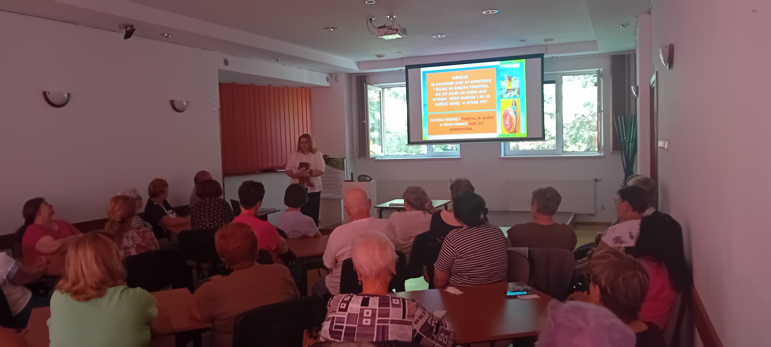 „Bezpieczne wakacje – półkolonie dla seniorów” – profilaktyka i edukacja dla zdrowego wypoczynku W dniu 30 lipca 2025 r. odbyły się zajęcia profilaktyczno-edukacyjne w Dzielnicowym Domu Kultury w Piekarach Śląskich, których celem było promowanie zdrowia i bezpieczeństwa osób starszych podczas letniego wypoczynku. Podczas spotkania pracownik PSSE w Bytomiu przedstawił zasady ochrony przed słońcem, sposoby właściwego nawodnienia organizmu, a także omówił nowoczesne zamienniki tytoniu. Szczególne zainteresowanie uczestników wzbudziły kleszcze zamknięte w probówkach, co pozwoliło lepiej zrozumieć, jak małe i trudne do zauważenia mogą być te pasożyty. Na zakończenie chętne osoby mogły wykonać zadania z wykorzystaniem alkogogli i narkogogli, które w bezpieczny sposób symulowały wpływ substancji odurzających na percepcję i koordynację ruchową.