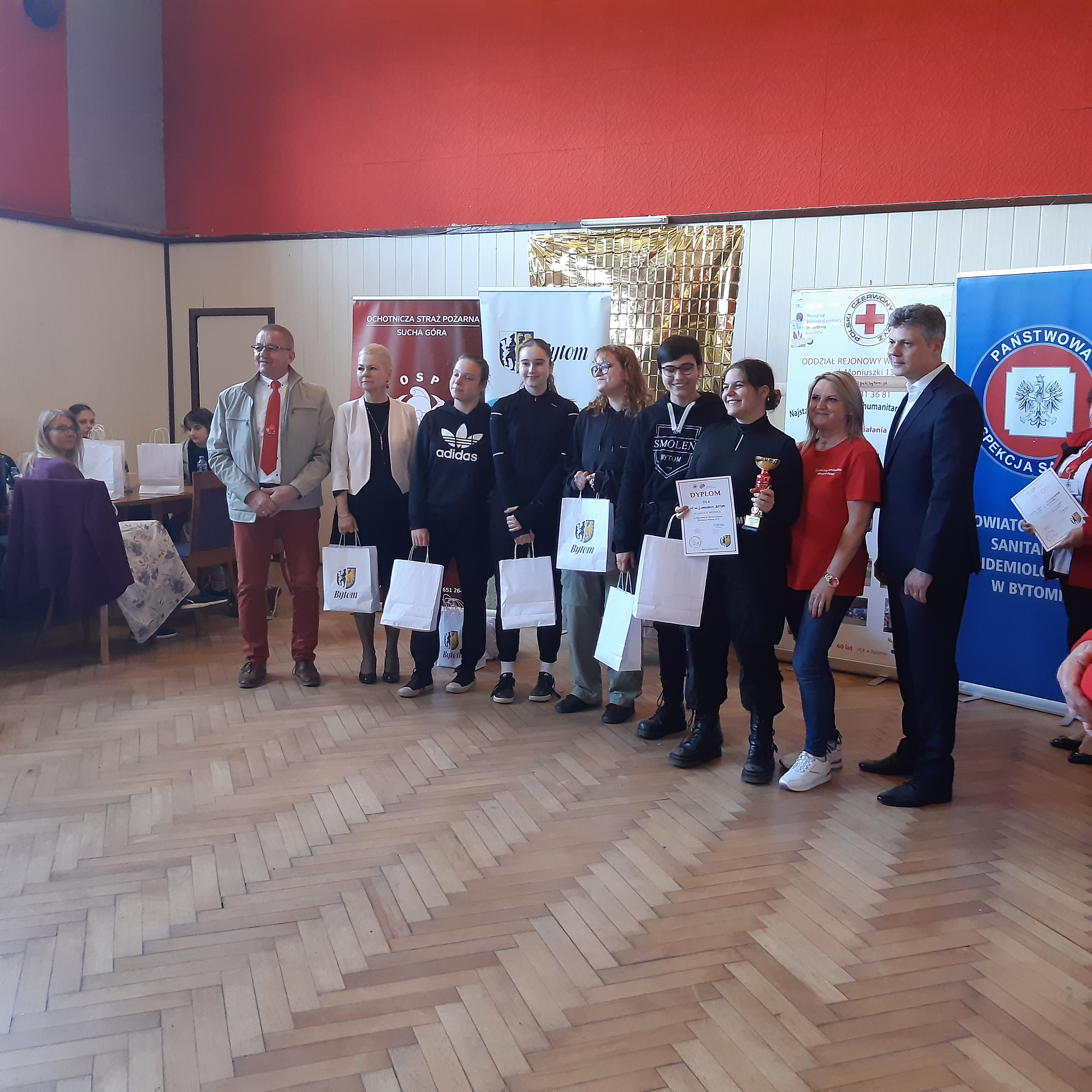 W dniu 26.04.2023 r. pracownicy Powiatowej Stacji Sanitarno-Epidemiologicznej w Bytomiu, na zaproszenie zarządu PCK - odział rejonowy w Bytomiu, wchodzili w skład komisji oceniającej młodzież ze szkół ponadpodstawowych w Rejonowych Mistrzostwach Pierwszej Pomocy, zorganizowanych na terenie OSP Sucha Góra. Zawody składały się z testów wiedzy z zakresu pierwszej pomocy i zdrowia oraz trzech sytuacji pozorowanych, gdzie oceniano umiejętności praktyczne młodzieży. I zadanie - Upadek ze schodów (złamanie otwarte podudzia) oraz odma płucna, w wyniku przebicia płuca fragmentem tarczy szlifierskiej, II zadanie - Zawał serca, III zadanie - Resuscytacja krążeniowo-oddechowa. W zawodach wzięły udział drużyny z terenu miasta Bytom i powiatu tarnogórskiego. Ponadto Państwowy Powiatowy Inspektor Sanitarny w Bytomiu przygotował dla opiekunów i uczniów stanowisko z materiałami informacyjno - edukacyjnymi z zakresu zdrowego stylu życia, profilaktyki HIV/AIDS, uzależnień (tytoń, środki psychoaktywne), chorób odkleszczowych i szczepień ochronnych.