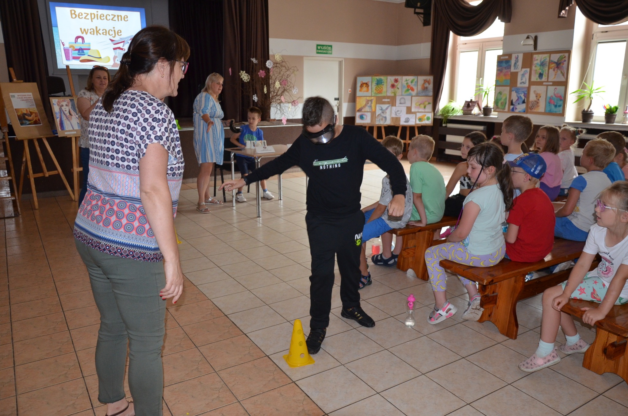 Zajęcia edukacyjno-profilaktyczne w ramach #bezpiecznewakacje2023, #latozsaneidem, tym razem dla dzieci uczestniczących w półkoloniach w Gminnym Ośrodku Kultury w Nakle Śląskim. Podczas spotkania przeprowadzono pogadankę podpartą prezentacją multimedialną na temat podstawowych zasad bezpiecznego zachowania podczas wakacji, korzystania z promieniowania słonecznego, zdrowego stylu życia oraz profilaktyki chorób odkleszczowych. Zainteresowane osoby mogły przekonać się, jaki wpływ na sprawność psychomotoryczną wywierają narkotyki i alkohol po wykonaniu określonych zadań w okularach typu alkogogle lub narkogogle. Na zakończenie zajęć, przygotowano quiz wiedzy z przygotowanymi pytaniami.