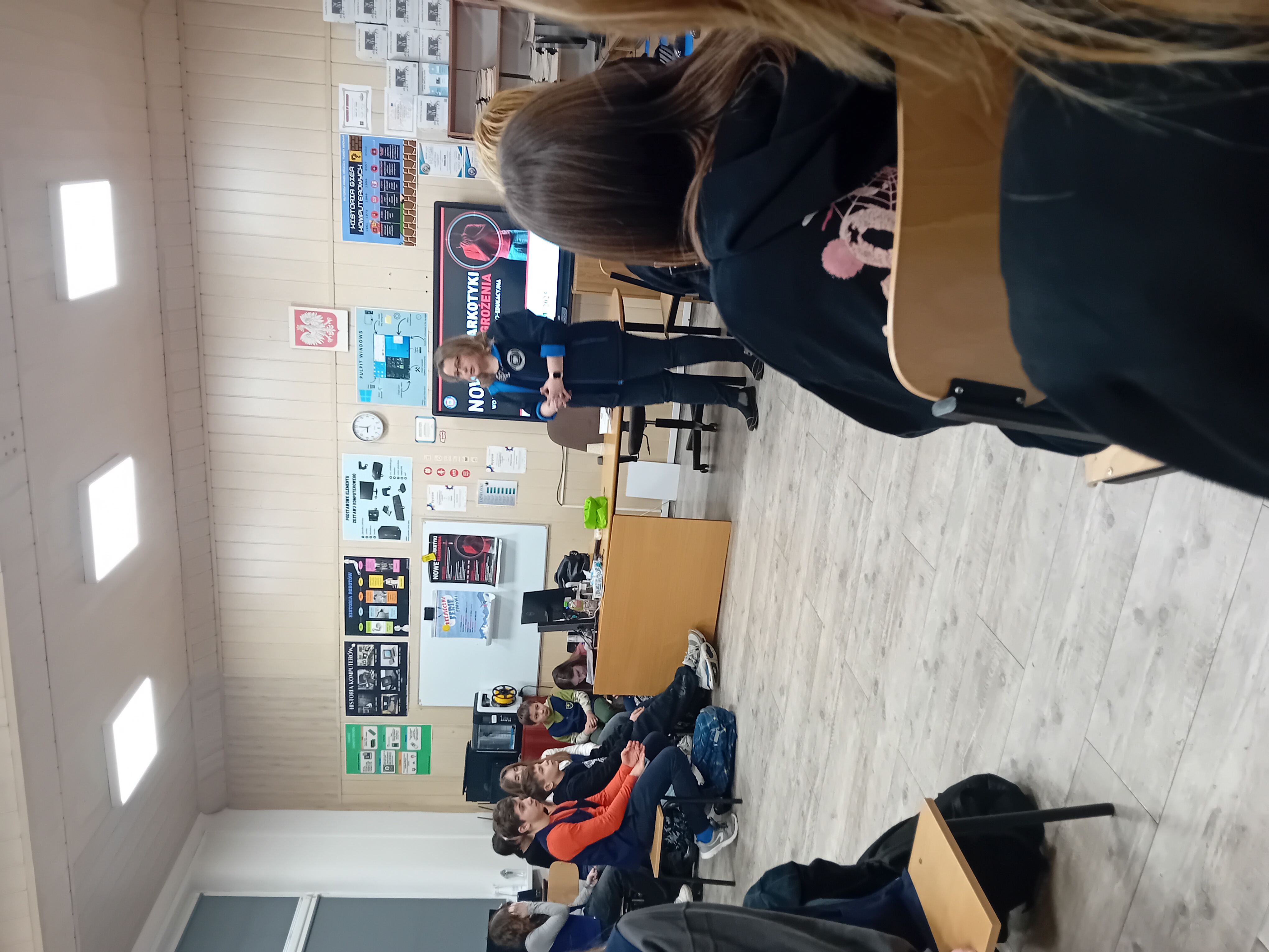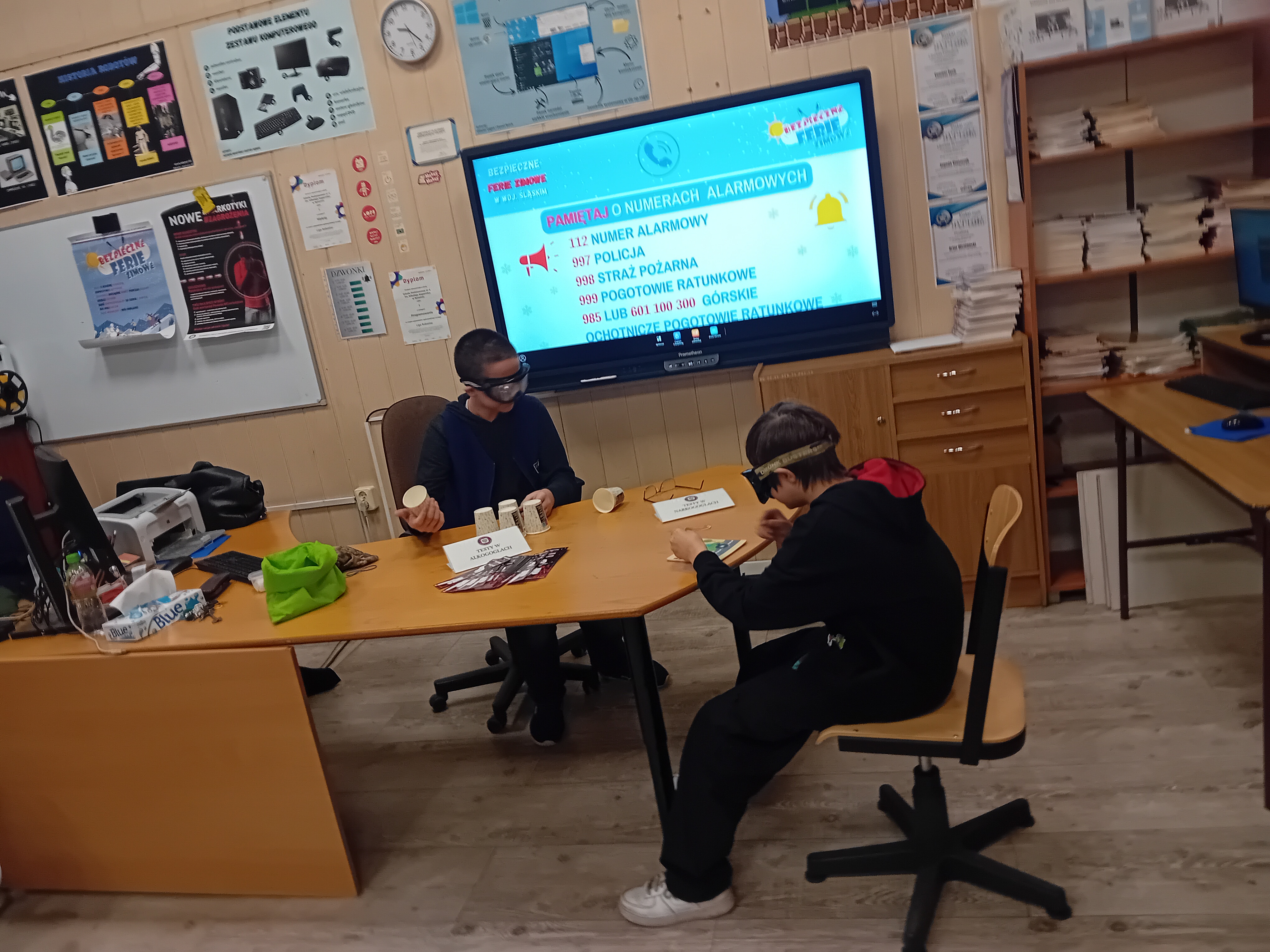 13 lutego br. w związku ze zbliżającymi się feriami w województwie śląskim przeprowadzono zajęcia profilaktyczne w Szkole Podstawowej nr 4 im. Mikołaja Kopernika w Bytomiu, dla uczniów klas VII i VIII. Przypomniano zasady bezpieczeństwa podczas ferii oraz przedstawiono problemy zdrowotne i zagrożenia wynikające z korzystania ze środków psychoaktywnych. Celem uzmysłowienia jak się „widzi” po zażyciu alkoholu i narkotyków uczniowie wykonywali zadania w specjalnych okularach alkogoglach i narkogoglach.