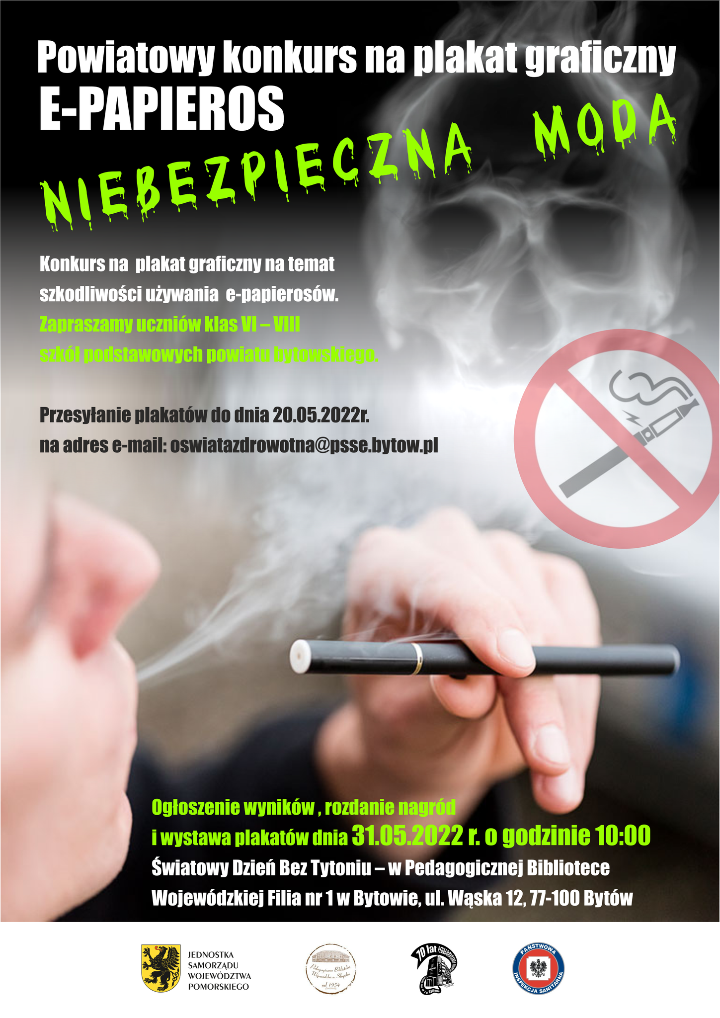 W związku z powyższym oraz ze zbliżającym się Światowym Dniem Bez Tytoniu (31 maja 2022r.) Państwowy Powiatowy Inspektor Sanitarny w Bytowie ogłasza powiatowy konkurs na plakat graficzny pod hasłem „E-papieros – niebezpieczna moda”. Konkurs skierowany jest do uczniów VI-VIII klas szkół podstawowych na terenie powiatu bytowskiego.
