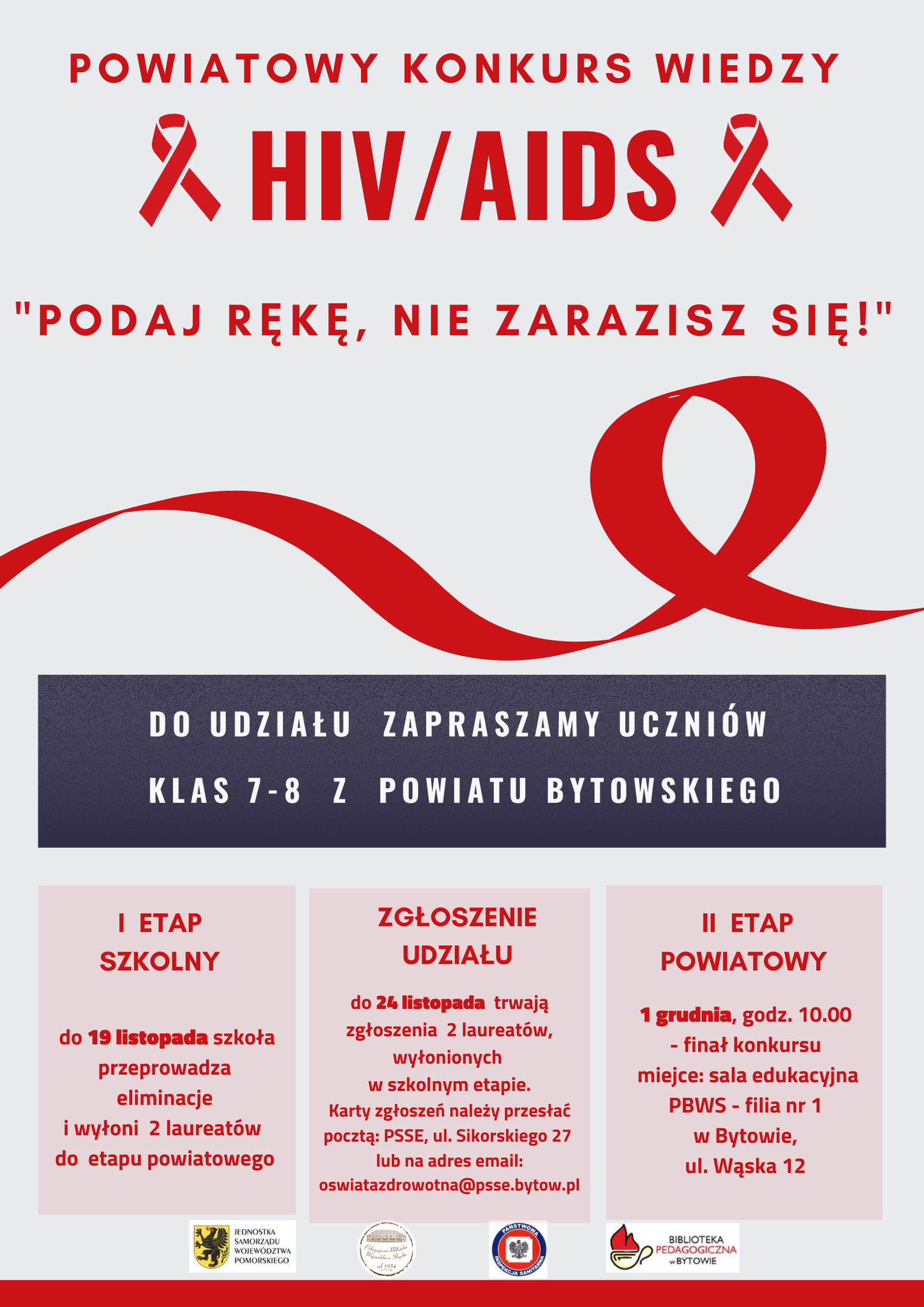 Z okazji zbliżającego się Światowego Dnia AIDS, który przypada na 1 grudnia, Państwowy Powiatowy Inspektor Sanitarny w Bytowie pragnie zaprosić na tegoroczny Powiatowy Konkurs Wiedzy o HIV/AIDS pod hasłem: „HIV/AIDS – podaj rękę, nie zarazisz się!”.