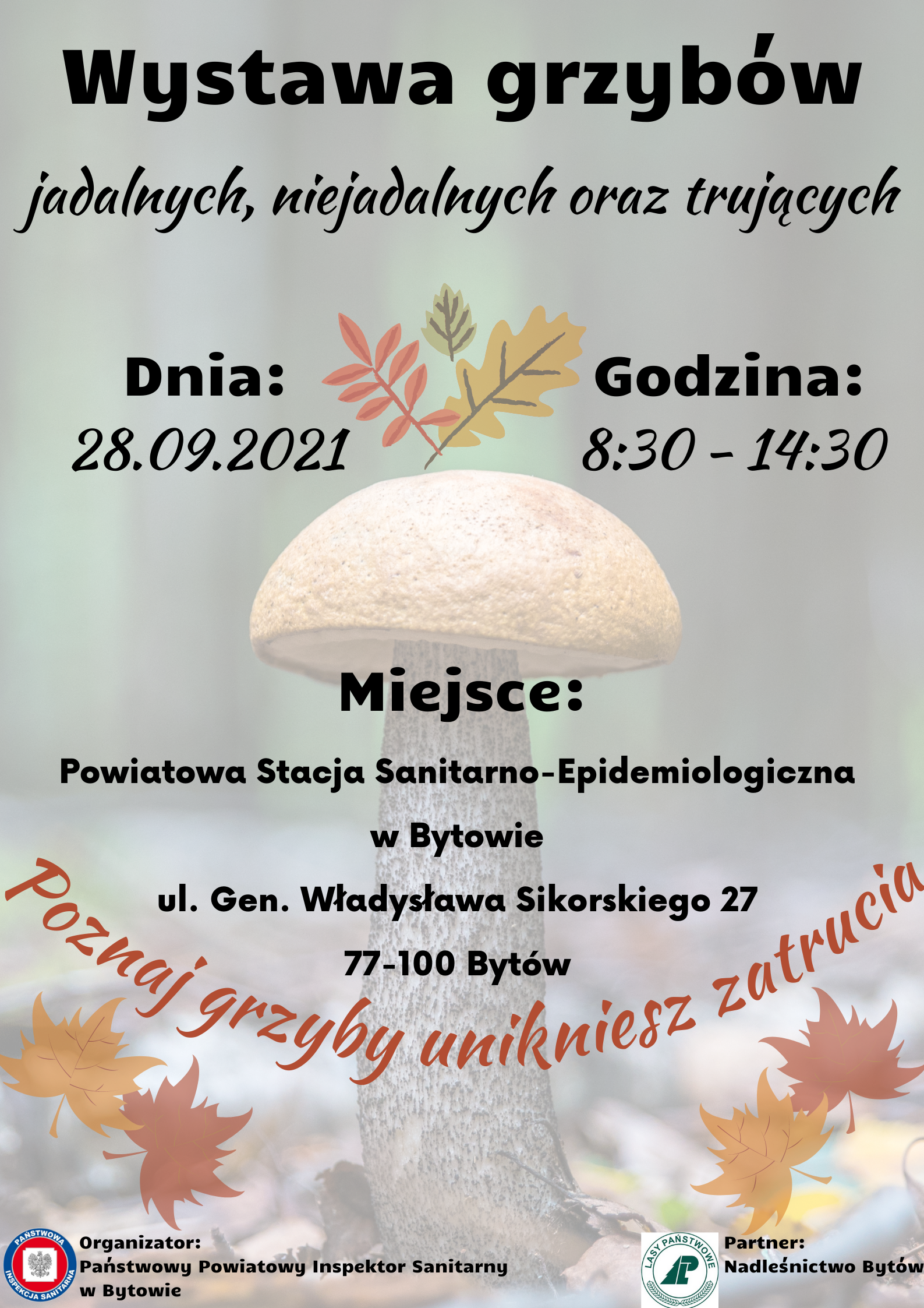 Państwowy Powiatowy Inspektor Sanitarny w Bytowie serdecznie zaprasza dzieci w wieku przedszkolnym (5-7 lat) na wystawę grzybów jadalnych, niejadalnych oraz trujących pod hasłem „Poznaj grzyby – unikniesz zatrucia”.