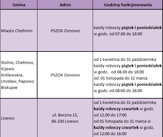 Wykaz działających Punktów Selektywnego Zbierania Odpadów Komunalnych (PSZOK) na terenie powiatu chełmińskiego wraz z godzinami ich funkcjonowania zamieszczono w załączniku.