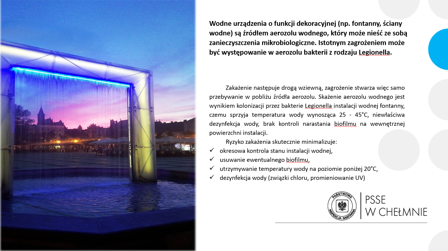 Wodne urządzenia o funkcji dekoracyjnej (np. fontanny, ściany wodne), także są źródłem aerozolu wodnego, który może nieść ze sobą zanieczyszczenia mikrobiologiczne. Istotnym zagrożeniem może być występowanie w aerozolu bakterii z rodzaju Legionella, Zakażenie następuje drogą wziewną, zagrożenie stwarza więc samo przebywanie w pobliżu źródła aerozolu. Skażenie aerozolu wodnego jest wynikiem kolonizacji przez bakterie Legionella instalacji wodnej fontanny, czemu sprzyja temperatura wody wynosząca 25 - 45°C, niewłaściwa dezynfekcja wody, brak kontroli narastania biofilmu na wewnętrznej powierzchni instalacji.