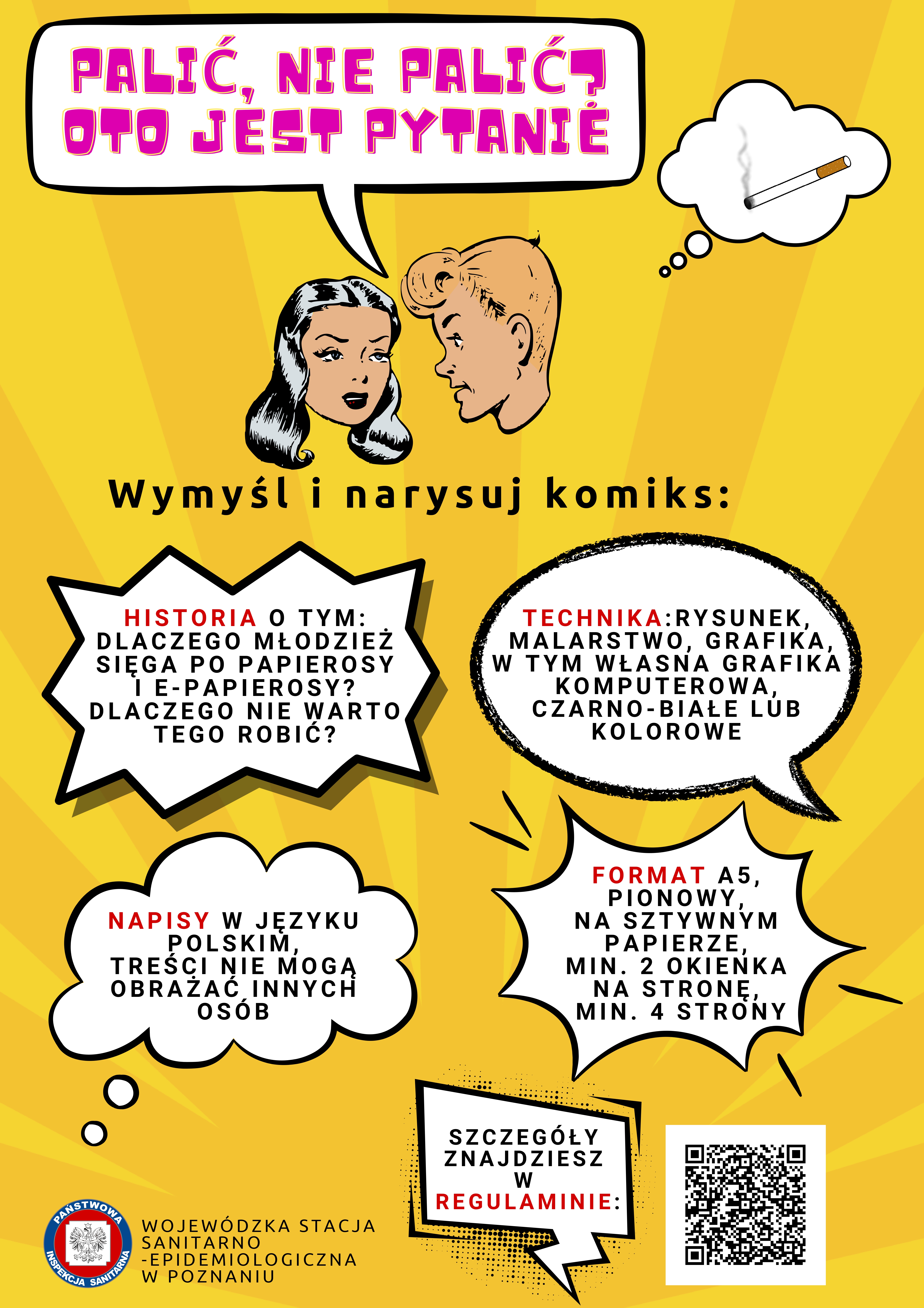 Zapraszamy uczniów klas V szkół podstawowych do udziału w kolejnej edycji konkursu pod hasłem „Palić, nie palić – oto jest pytanie?”. Tegoroczne zadanie konkursowe polega na wykonaniu komiksu nt. palenia tytoniu, używania e-papierosów i innych wyrobów tytoniowych.