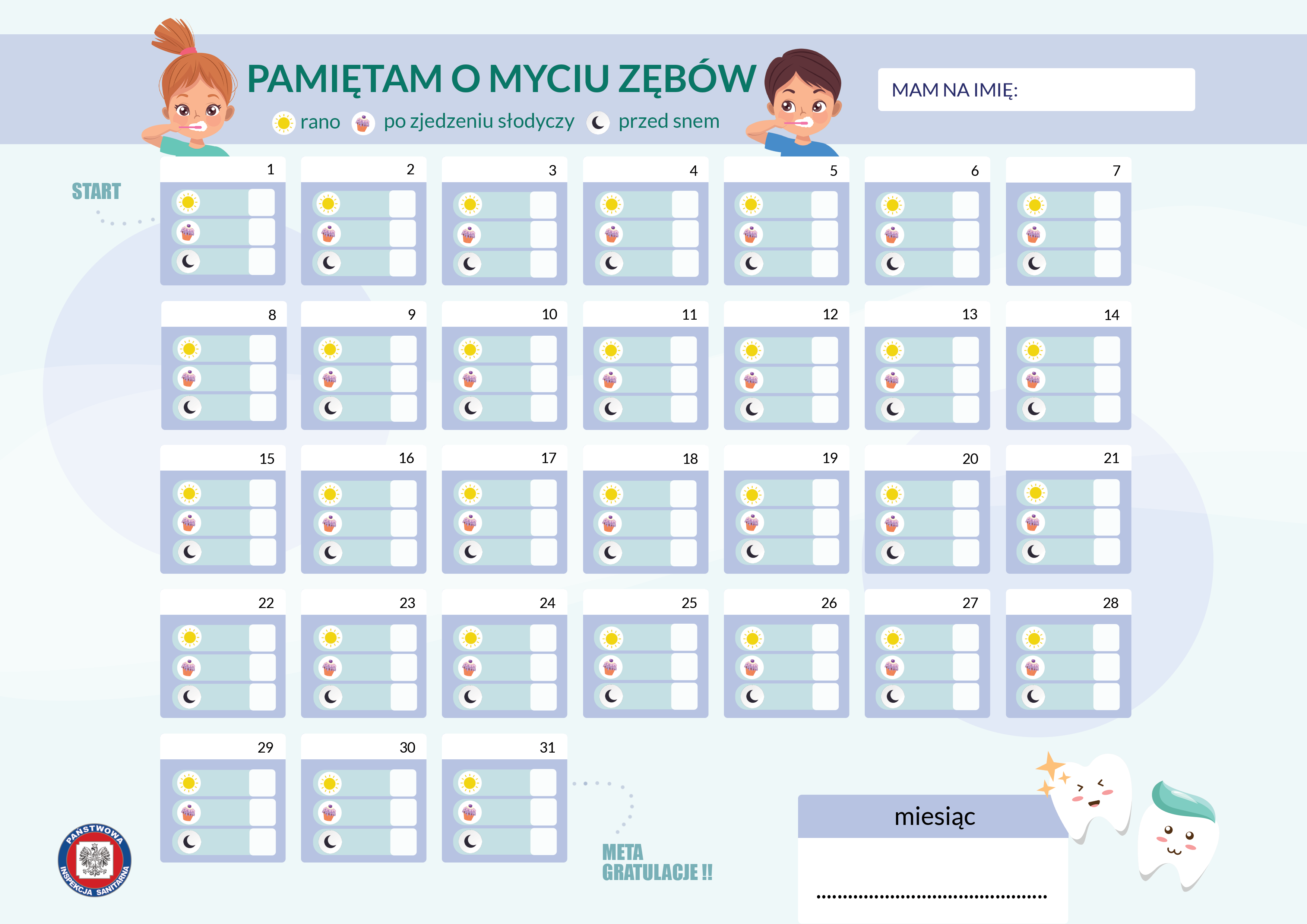 Projekt „Mam zdrowe zęby!” wzbogacony jest o liczne materiały graficzne a każda powiatowa stacja sanitarno-epidemiologiczna otrzymała duży model szczęki ze szczoteczką służący do instruktażu poprawnego mycia zębów. Broszura dla dzieci zawiera ważne merytoryczne wskazówki jak dbać o higienę jamy ustnej i zębów oraz ciekawe zagadki. Dodatkowo uzyskała pozytywną opinię Konsultanta Wojewódzkiego w dziedzinie stomatologii dziecięcej. Każdy uczestnik spotkania otrzymuje również magnez i kalendarz mycia zębów.