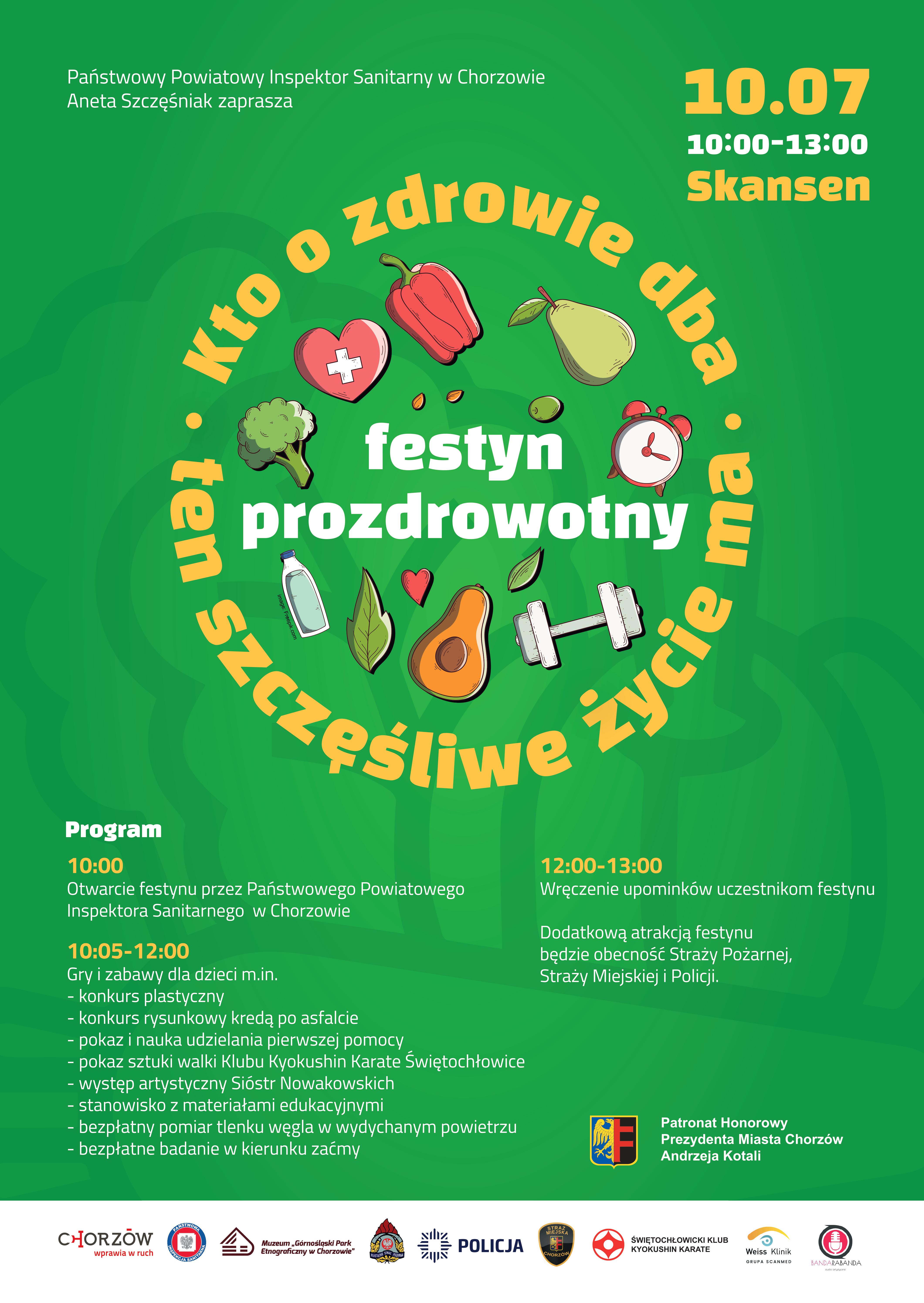 Z wielką przyjemnością zapraszamy na festyn prozdrowotny pod hasłem „Kto o zdrowie dba, ten szczęśliwe życie ma”, który odbędzie się w najbliższy poniedziałek tj. 10 lipca w Muzeum "Górnośląski Park Etnograficzny w Chorzowie". Wstęp na teren chorzowskiego skansenu w tym dniu jest WOLNY. Podczas wydarzenia osoby dorosłe będą mogły skorzystać z bezpłatnych badań w kierunku zaćmy oraz dokonać bezpłatnego pomiaru tlenku węgla w wydychanym powietrzu. Dla dzieci przygotowano konkurs plastyczny i konkurs rysunkowy kredą po asfalcie. Podczas wydarzenia na scenie zostanie zaprezentowany pokaz sztuki walki Klubu Kyokushin Karate Świętochłowice oraz występ artystyczny duetu Sióstr Nowakowskich. Na miejscu będą także stanowiska z instruktażem udzielania pierwszej pomocy oraz materiałami edukacyjnymi na temat zdrowia. Na pełen atrakcji festyn zapraszamy w godzinach 10:00 – 13:00. Współorganizatorem wydarzenia jest Urząd Miasta Chorzów.