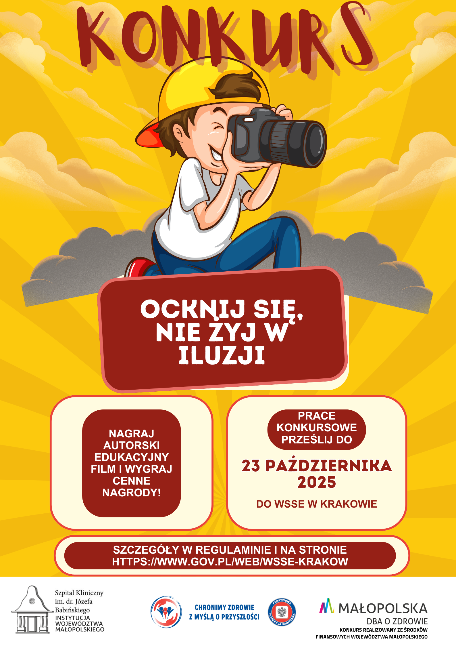 Wojewódzka Stacja Sanitarno-Epidemiologiczna w Krakowie, we współpracy z Wojewódzkim Ośrodkiem Terapii Uzależnienia i Współuzależnienia Szpitala Klinicznego im. dr. Józefa Babińskiego SP ZOZ w Krakowie, ogłasza konkurs na film krótkometrażowy pt. „Ocknij się, nie żyj w iluzji”.