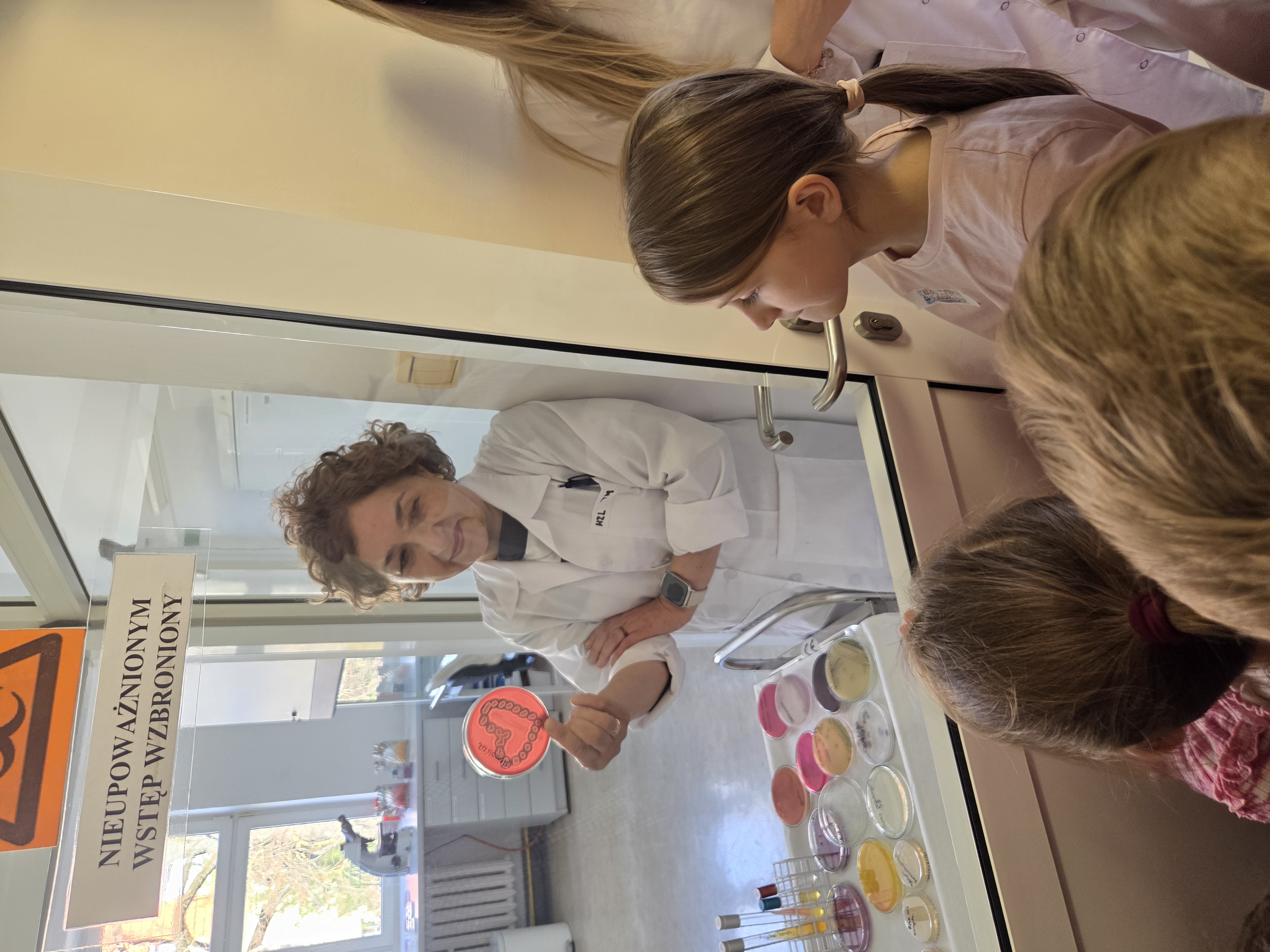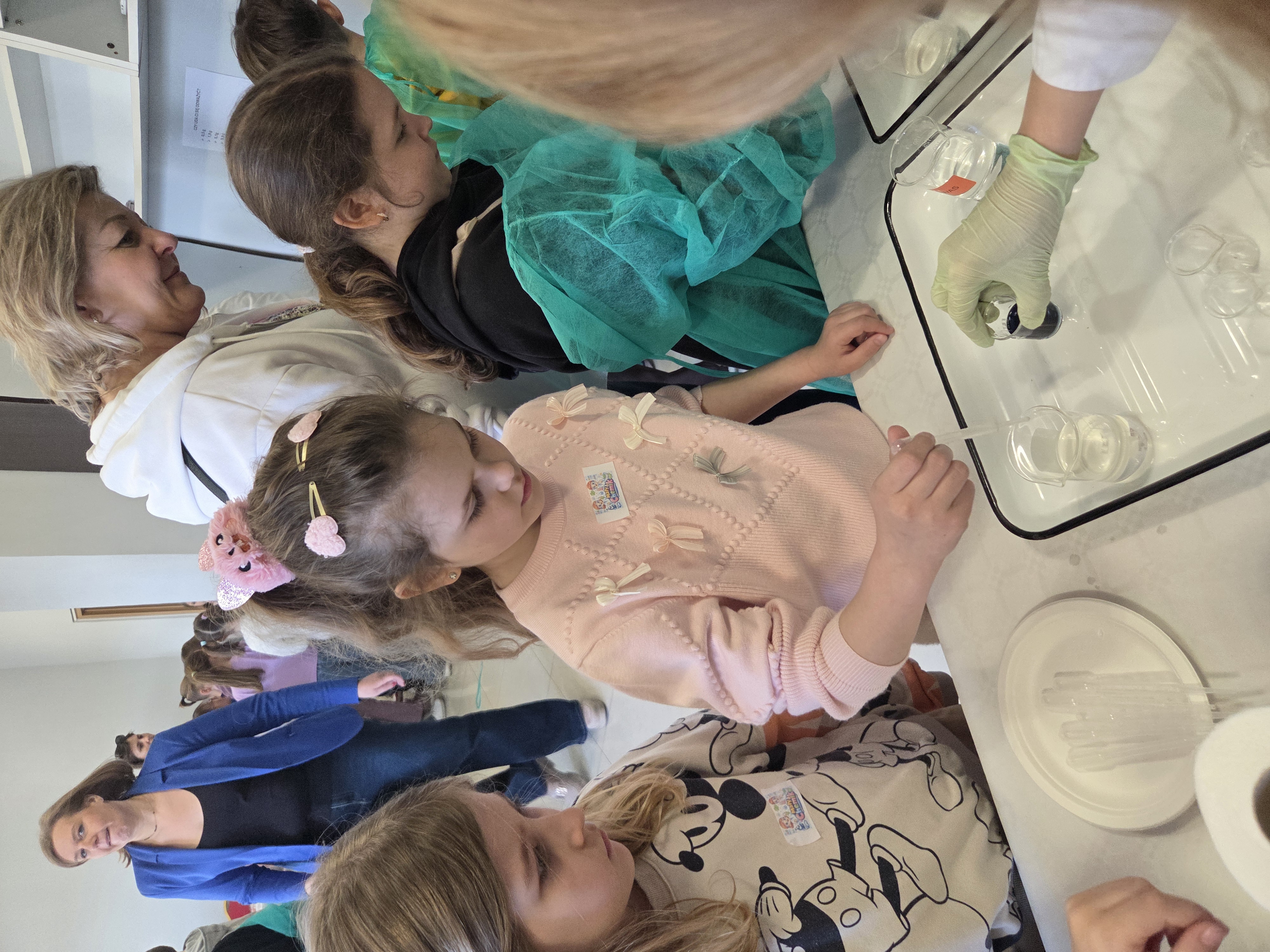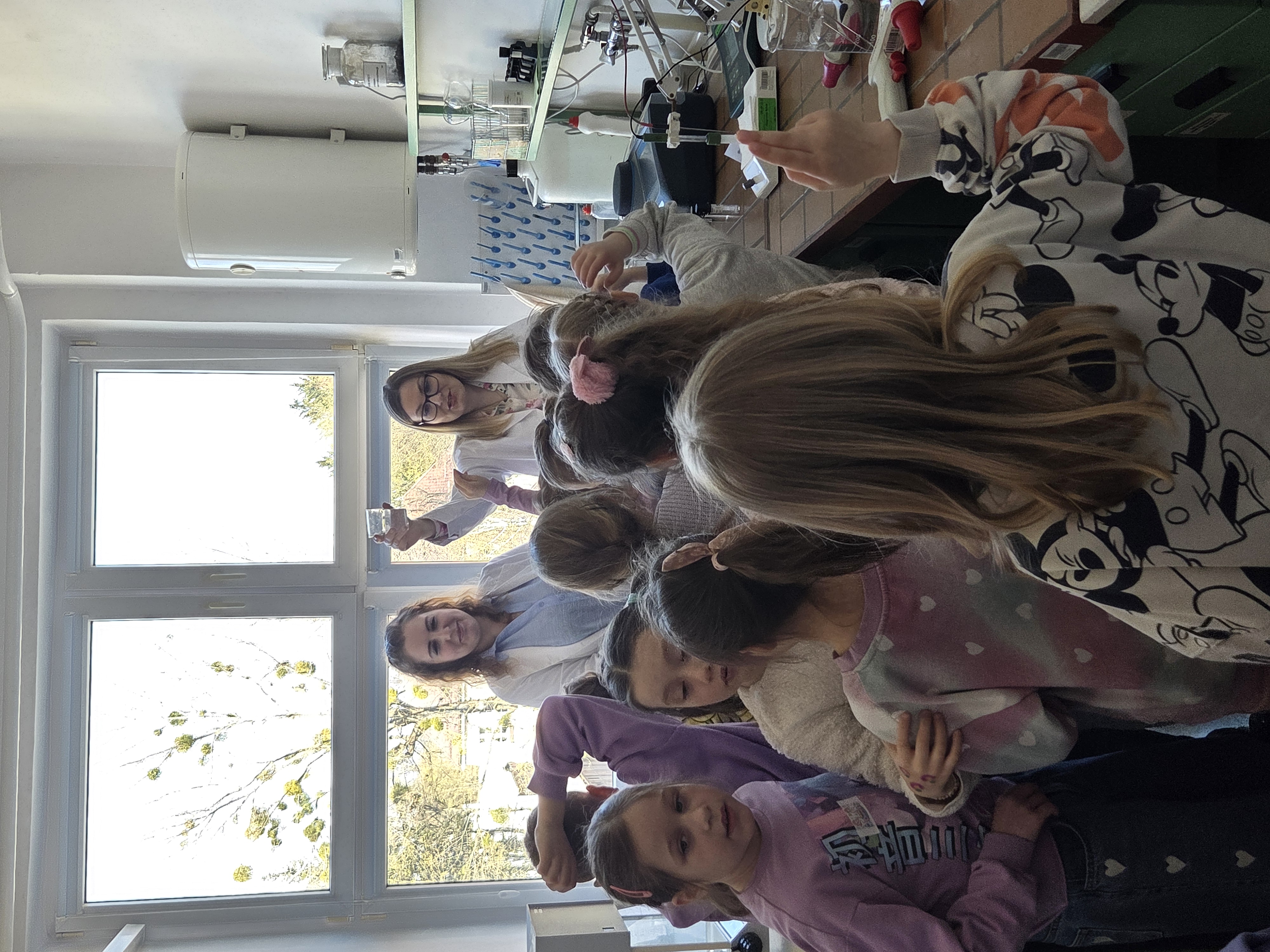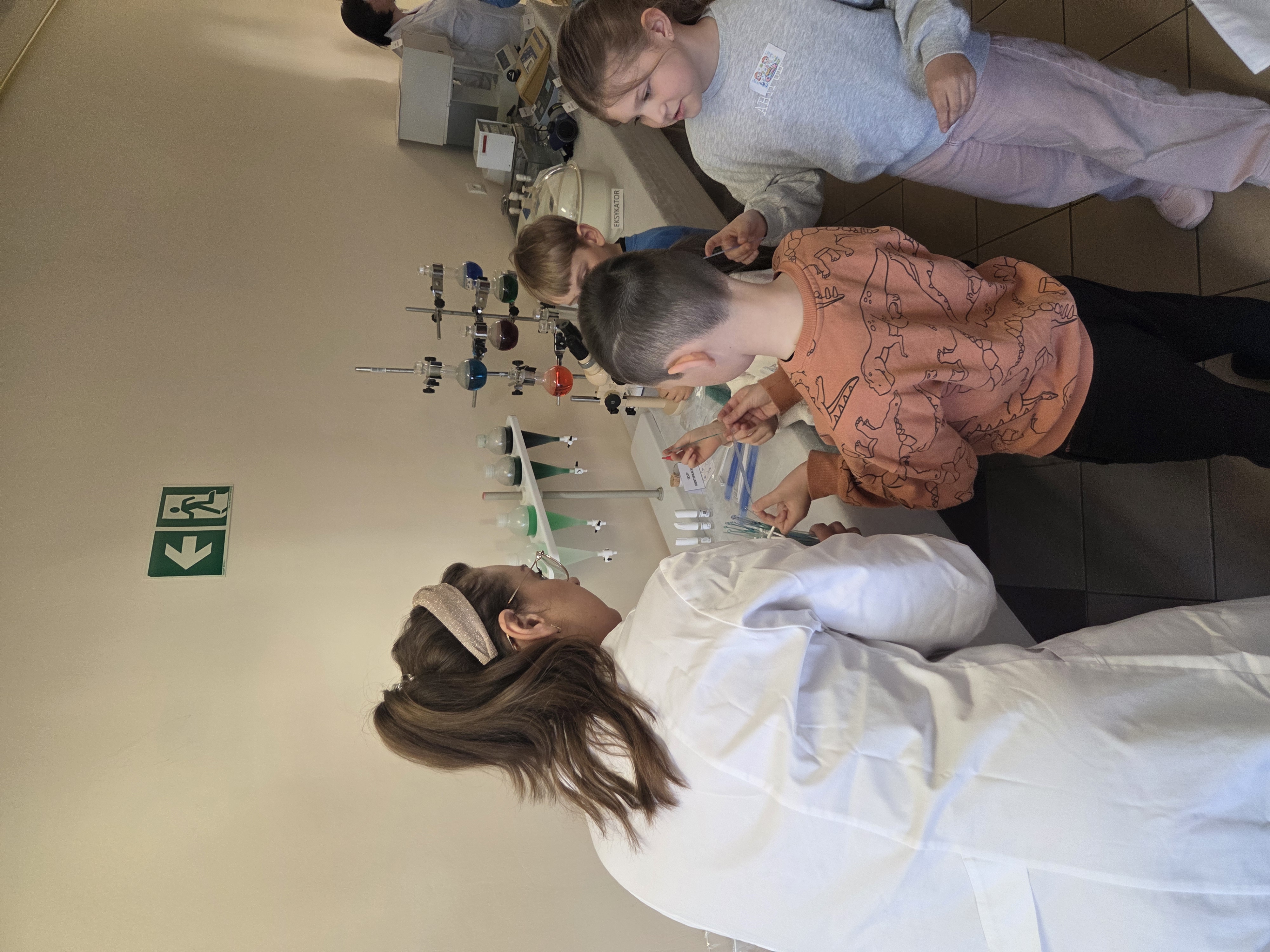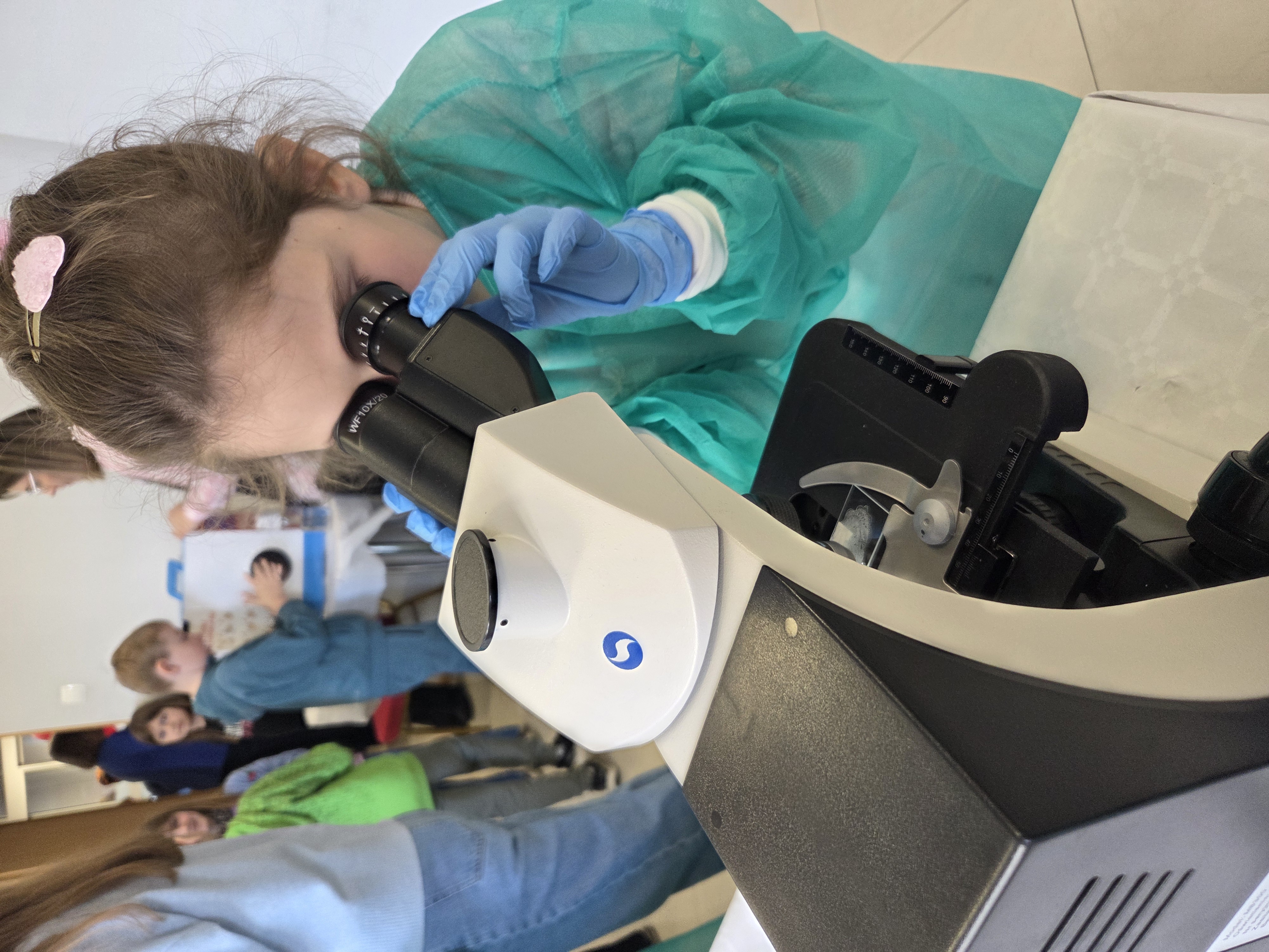 Pod mikroskopem obserwowaliśmy drożdże, wyhodowaną pleśń, lampy lawy, bakterie wyhodowane z rozmaitych powierzchni: klamek, poręczy, telefonów komórkowych itp. – co wzbudziło niemałe emocje! 🦠😄 Było też ważenie, eksperymenty z napięciem powierzchniowym z użyciem brokatu oraz barwienie przy pomocy naturalnych składników – kapusty, szpinaku i kwasku cytrynowego. Ogromnym zainteresowaniem cieszyła się również ekspozycja sprzętu laboratoryjnego – można było zobaczyć