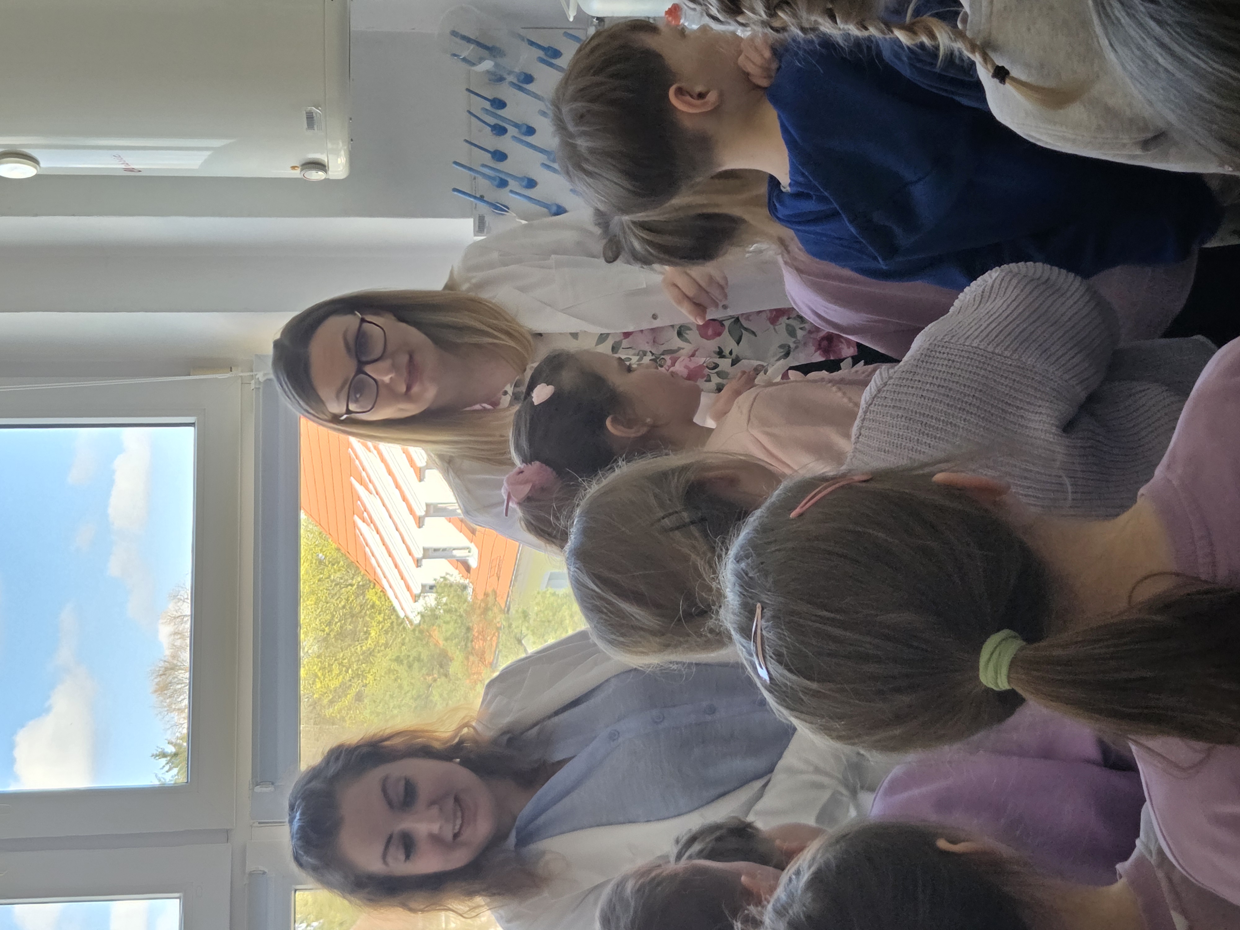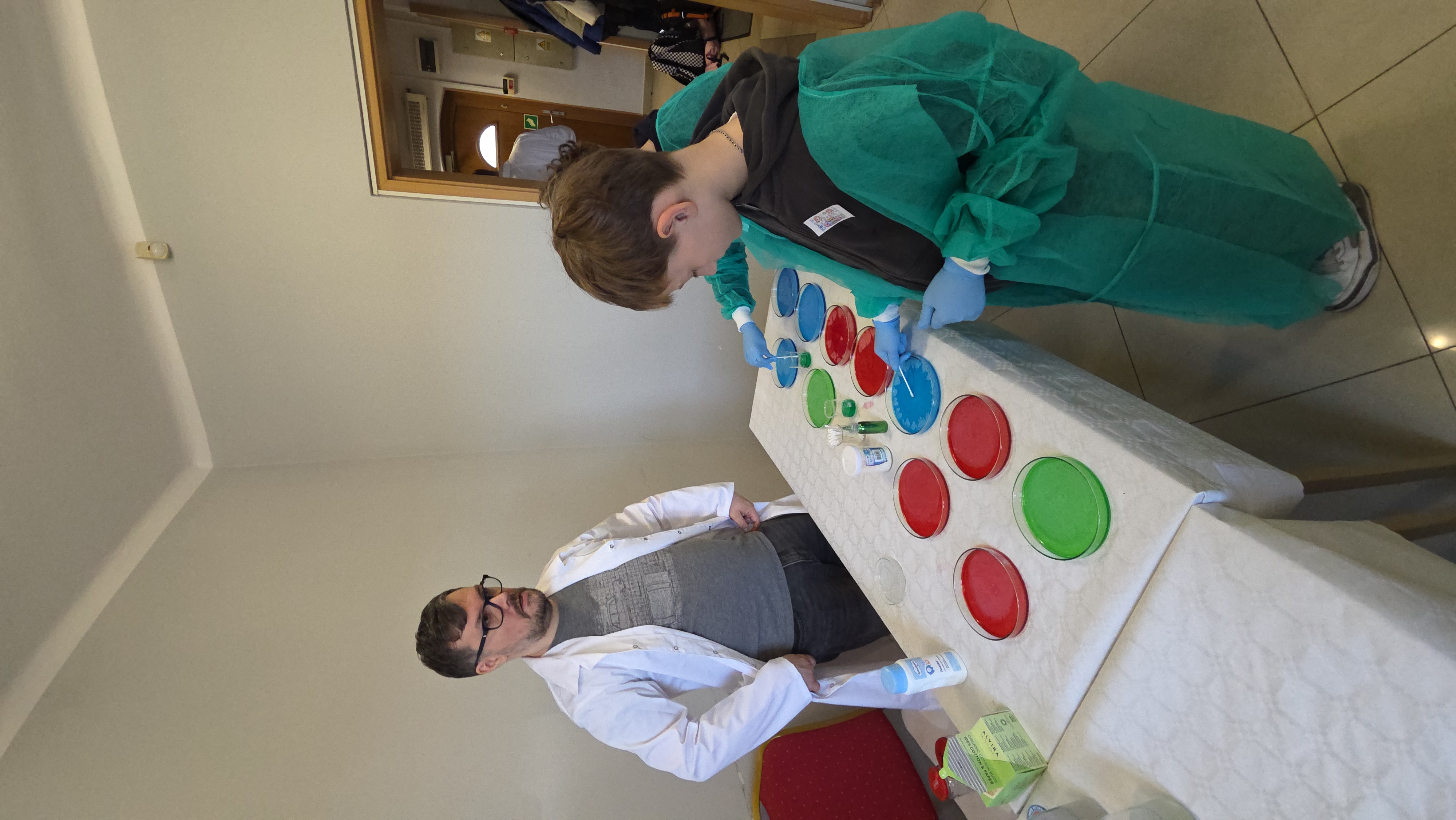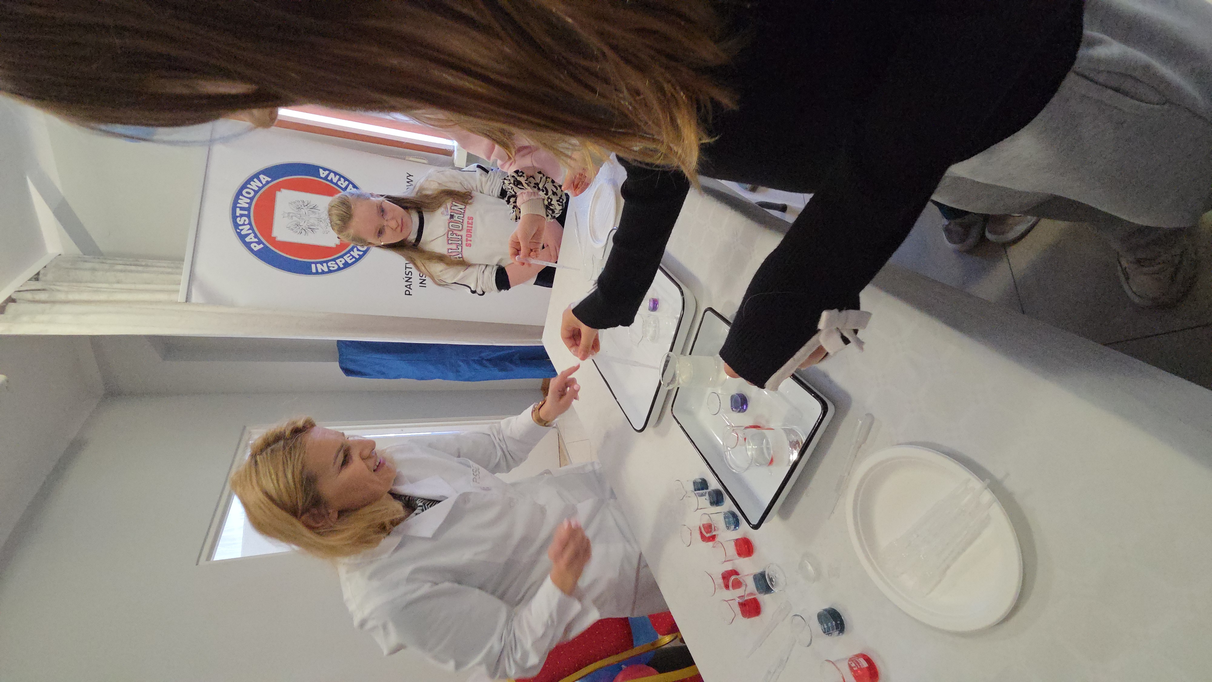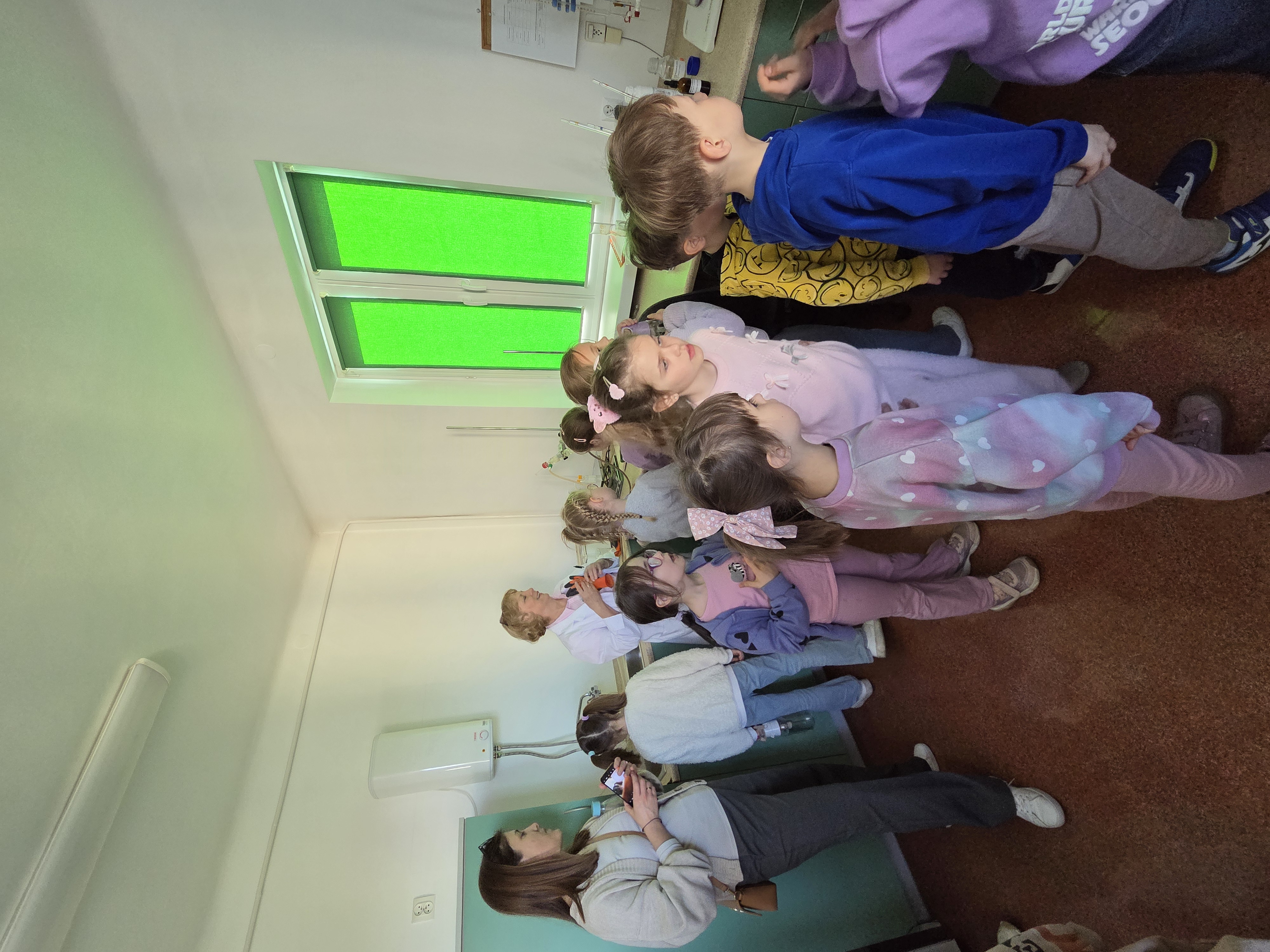 Pod mikroskopem obserwowaliśmy drożdże, wyhodowaną pleśń, lampy lawy, bakterie wyhodowane z rozmaitych powierzchni: klamek, poręczy, telefonów komórkowych itp. – co wzbudziło niemałe emocje! 🦠😄 Było też ważenie, eksperymenty z napięciem powierzchniowym z użyciem brokatu oraz barwienie przy pomocy naturalnych składników – kapusty, szpinaku i kwasku cytrynowego. Ogromnym zainteresowaniem cieszyła się również ekspozycja sprzętu laboratoryjnego – można było zobaczyć