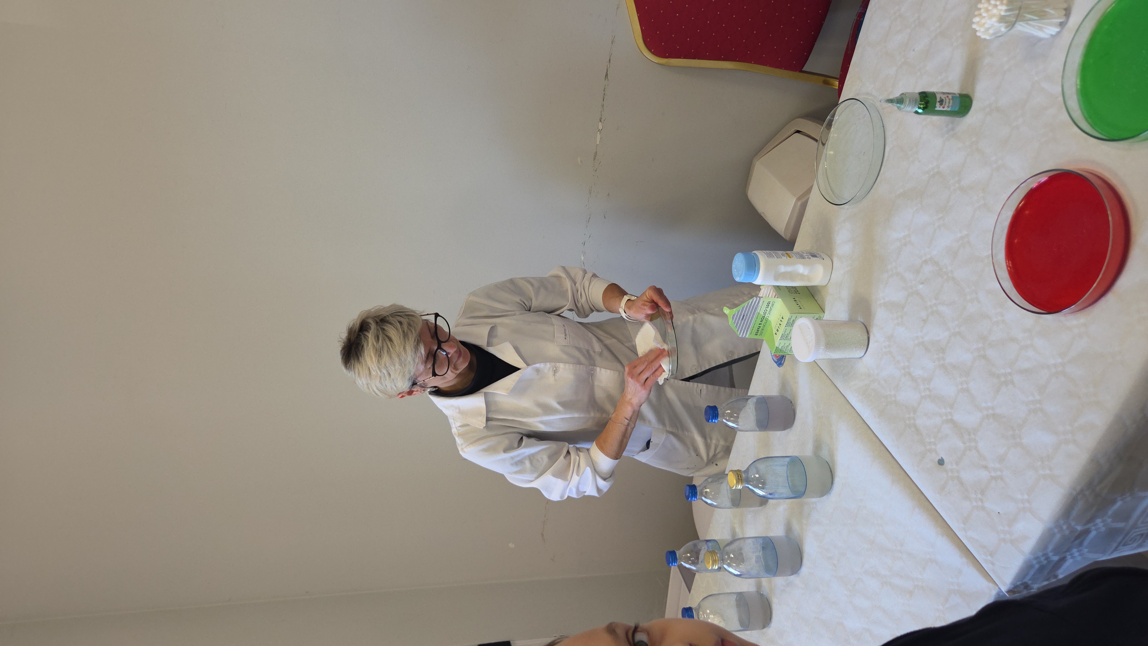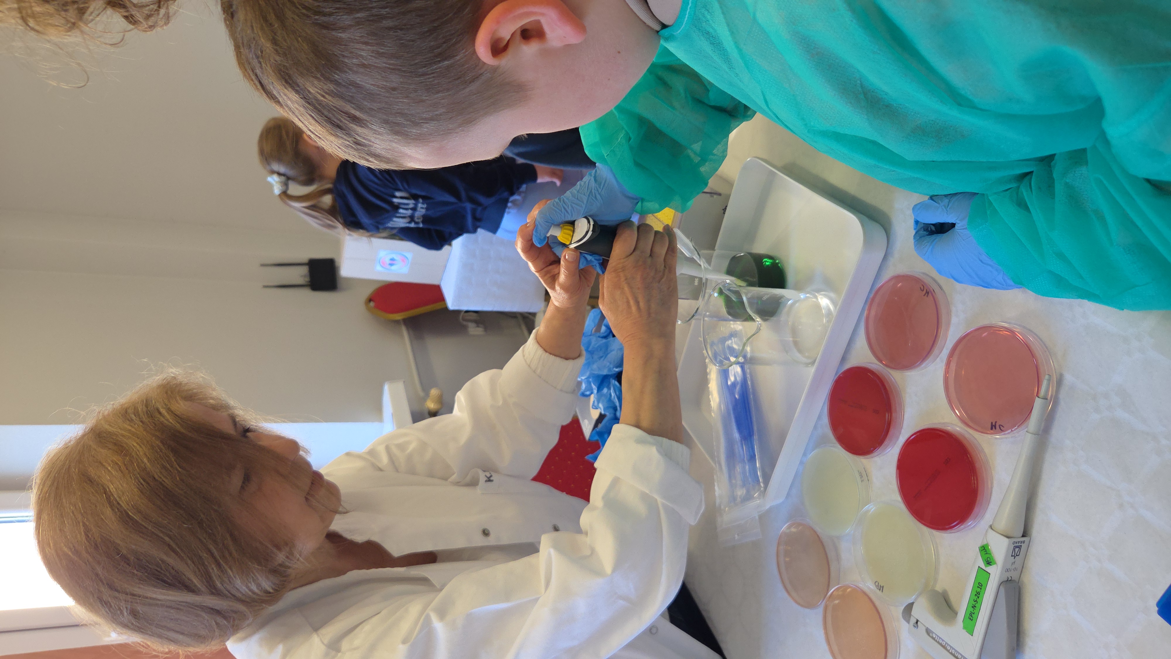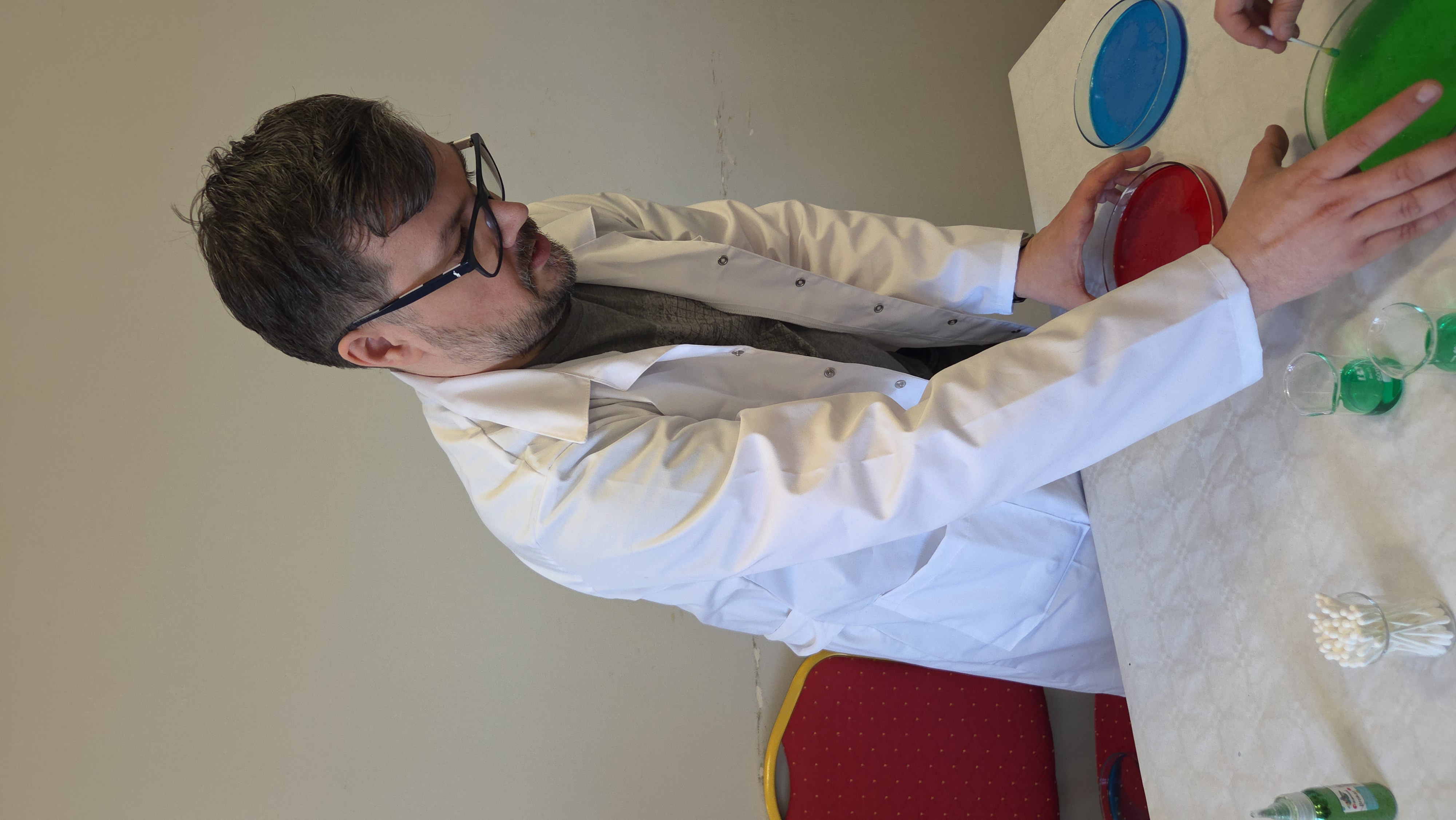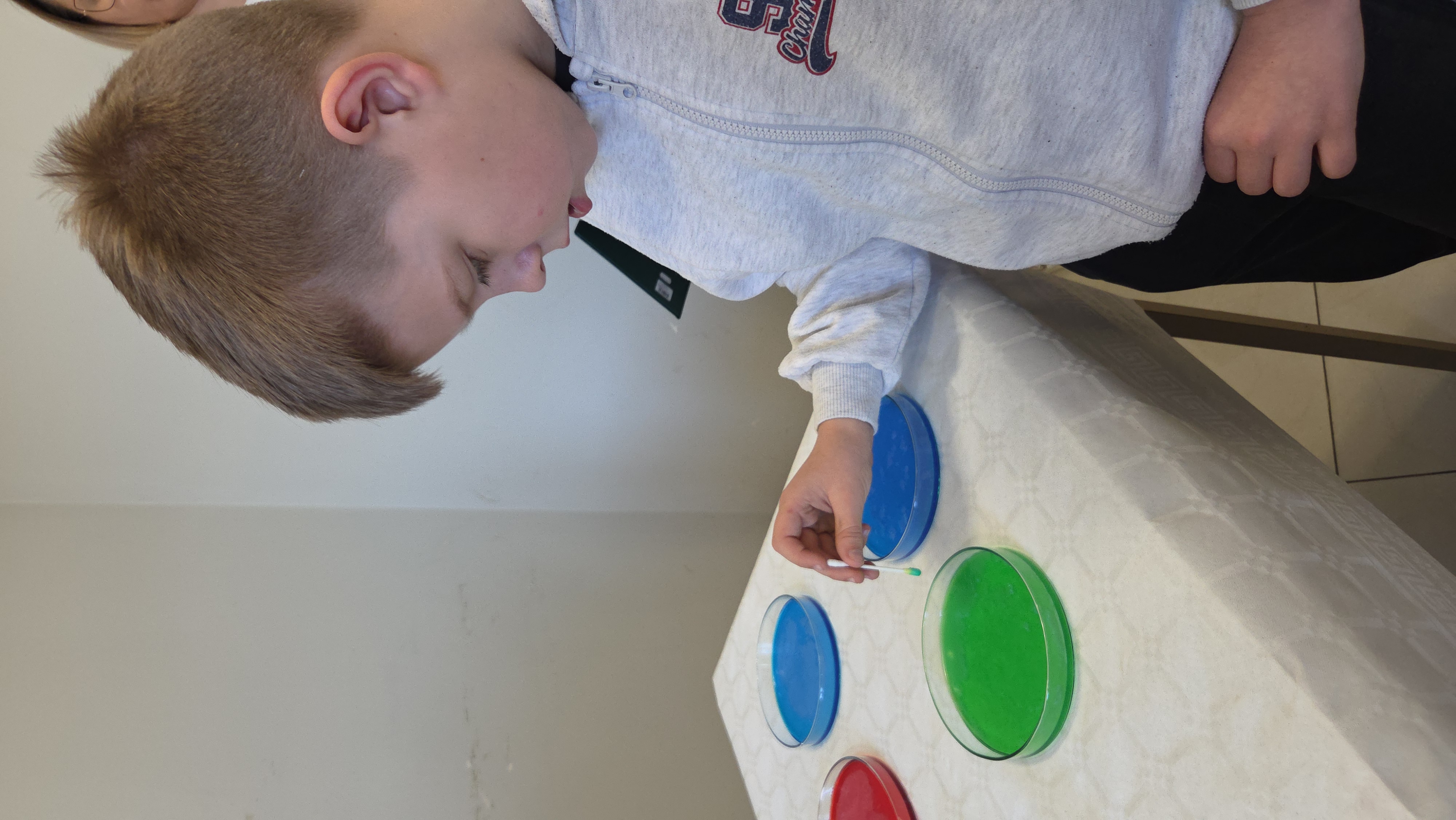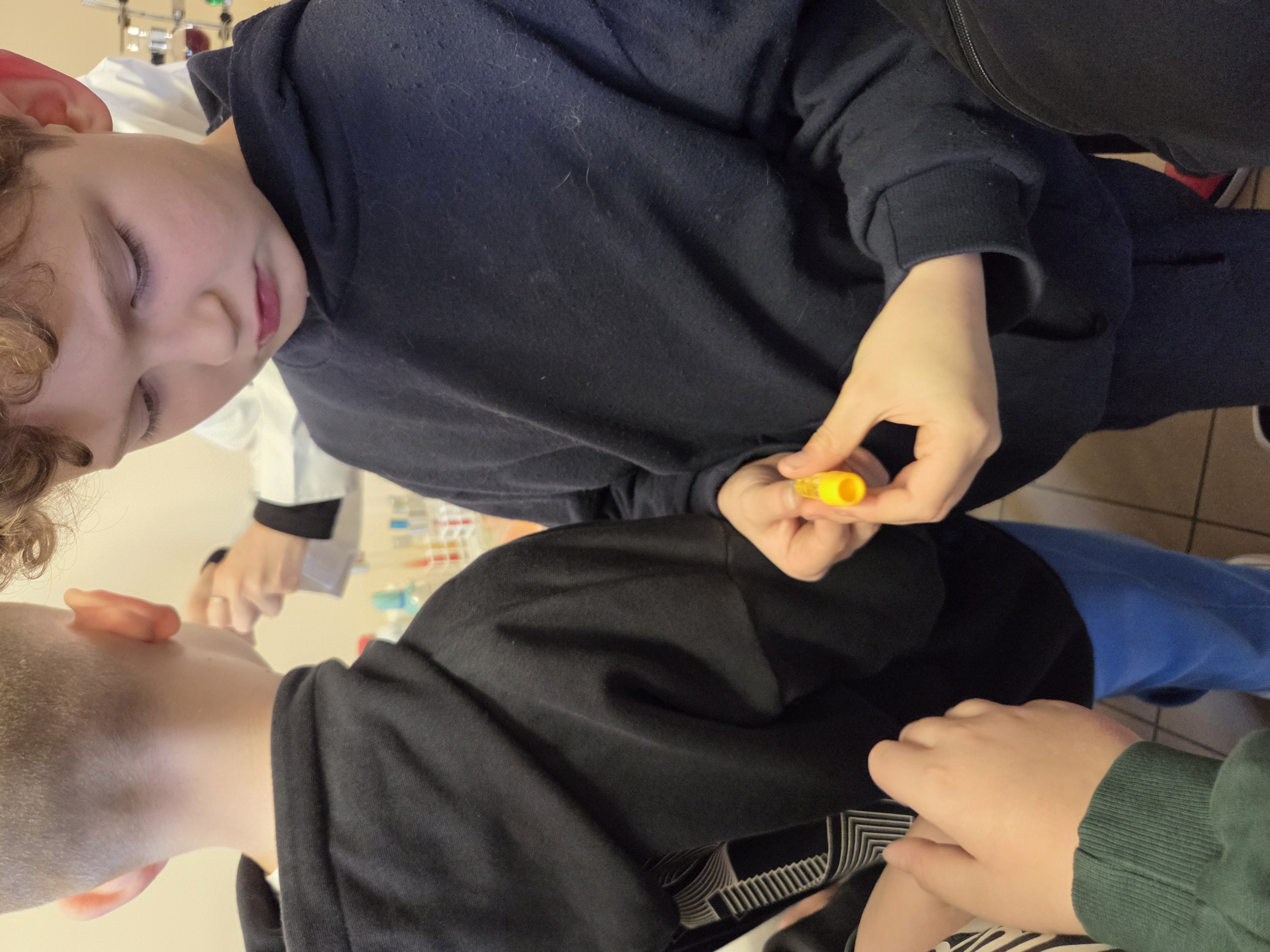 Pod mikroskopem obserwowaliśmy drożdże, wyhodowaną pleśń, lampy lawy, bakterie wyhodowane z rozmaitych powierzchni: klamek, poręczy, telefonów komórkowych itp. – co wzbudziło niemałe emocje! 🦠😄 Było też ważenie, eksperymenty z napięciem powierzchniowym z użyciem brokatu oraz barwienie przy pomocy naturalnych składników – kapusty, szpinaku i kwasku cytrynowego. Ogromnym zainteresowaniem cieszyła się również ekspozycja sprzętu laboratoryjnego – można było zobaczyć