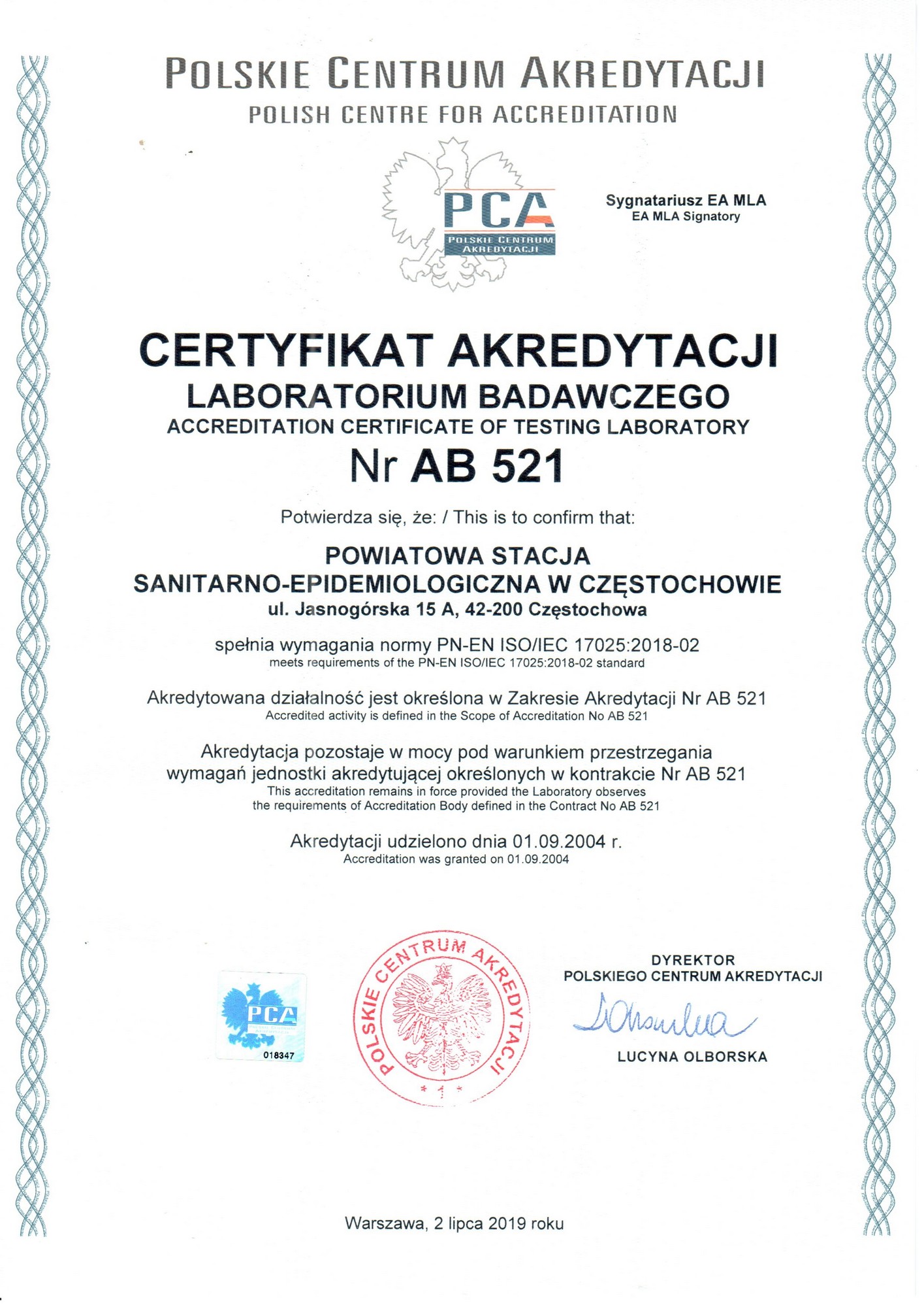Potwierdzeniem kompetencji oraz spełnienia wymagań normy PN-EN ISO/IEC 17025 jest uzyskany w 2004r. Certyfikat Polskiego Centrum Akredytacji nr AB 521.