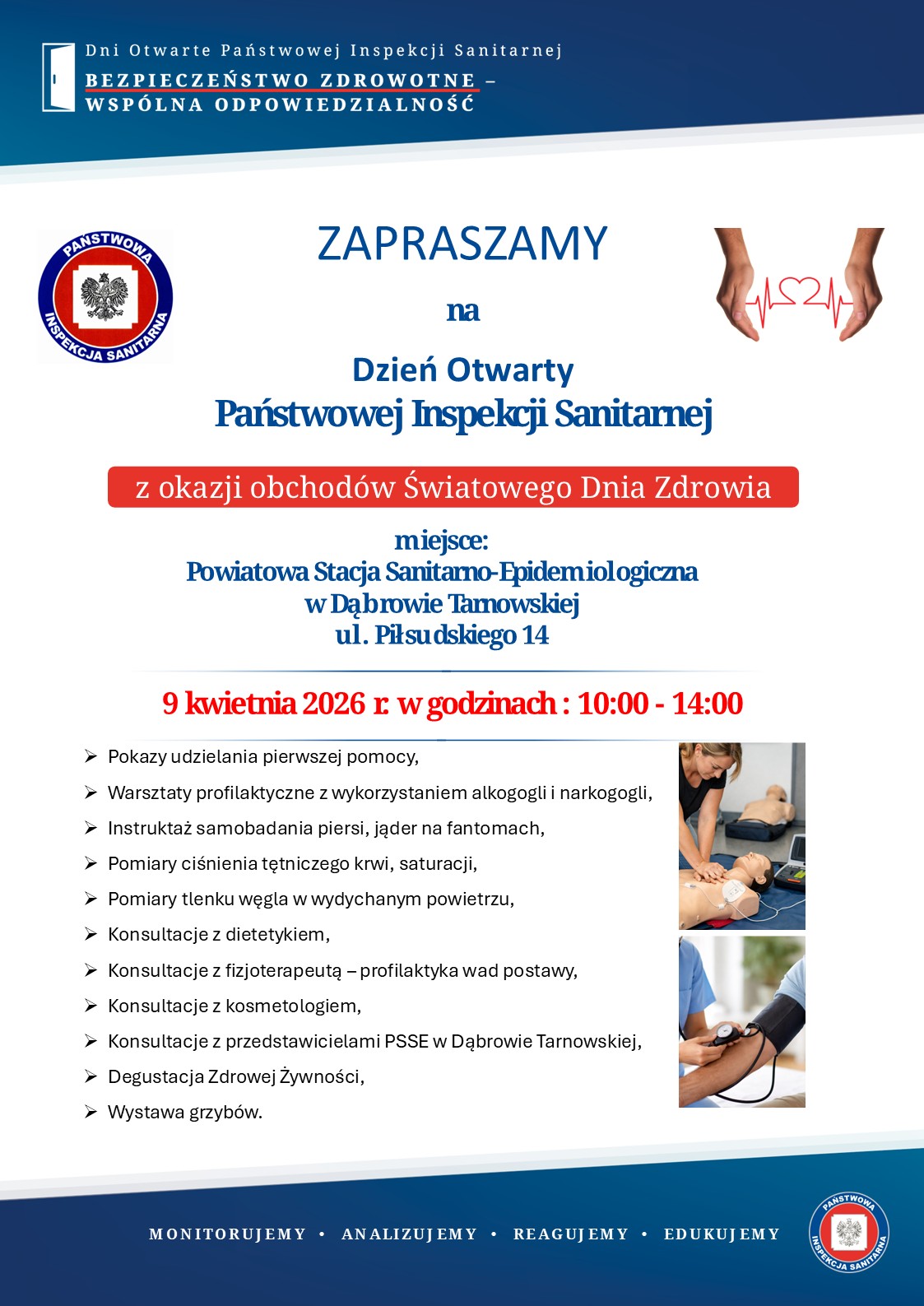Państwowy Powiatowy Inspektor Sanitarny w Dąbrowie Tarnowskiej serdecznie zaprasza na Dzień Otwarty Państwowej Inspekcji Sanitarnej w Dąbrowie Tarnowskiej, który odbędzie się 9 kwietnia 2026 r. w godzinach 10:00 - 14:00 w siedzibie Powiatowej Stacji Sanitarno-Epidemiologicznej w Dąbrowie Tarnowskiej, ul. Piłsudskiego 14.